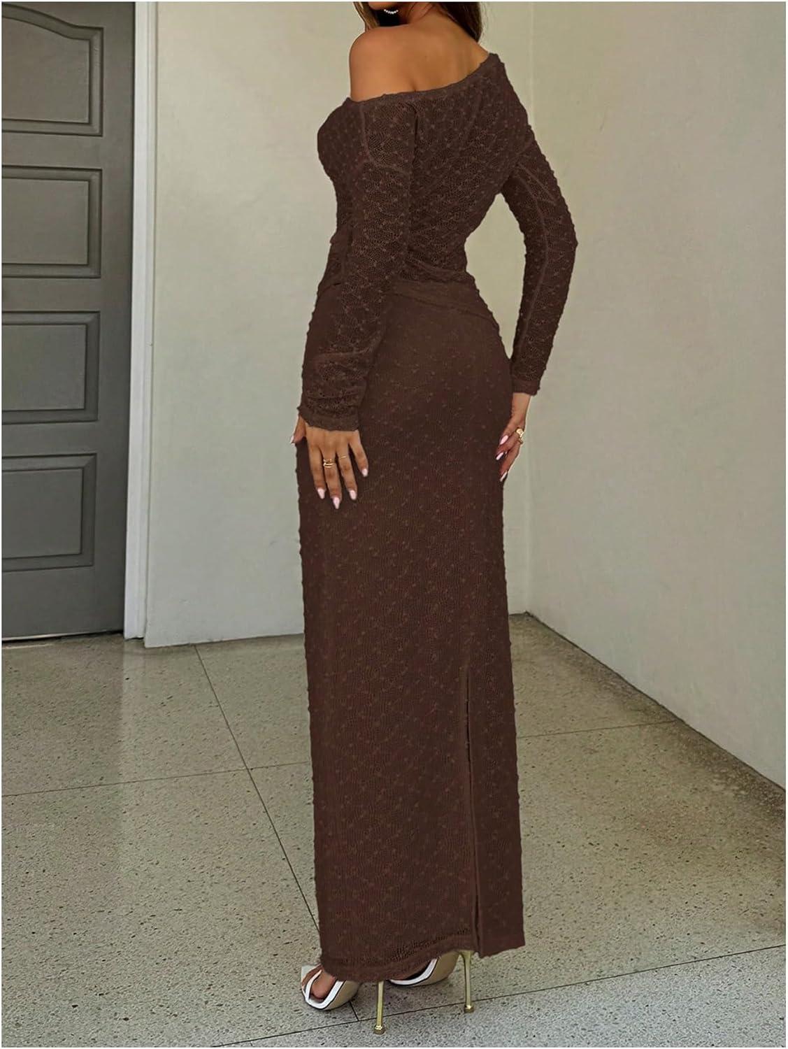 MakeMeChic Women’s 2 Piece Fall Outfits Long Sleeve Asymmetrical Tops and Bodycon Maxi Skirt Matching Sets(Coffee Brown)
