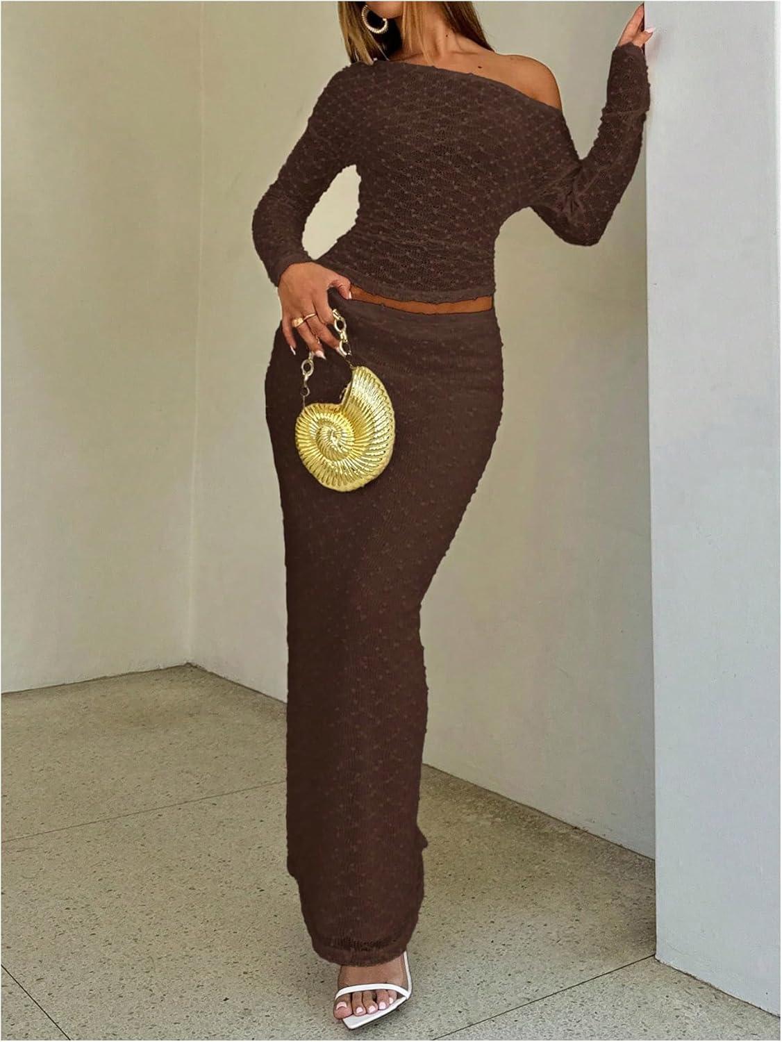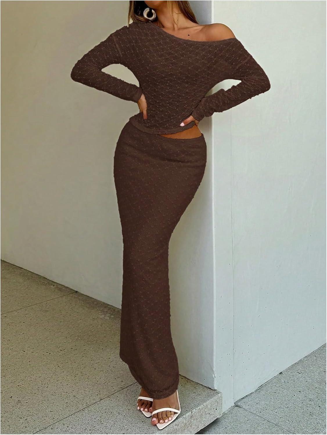 MakeMeChic Women's 2 Piece Fall Outfits Long Sleeve Asymmetrical Tops and Bodycon Maxi Skirt Matching Sets(Coffee Brown)