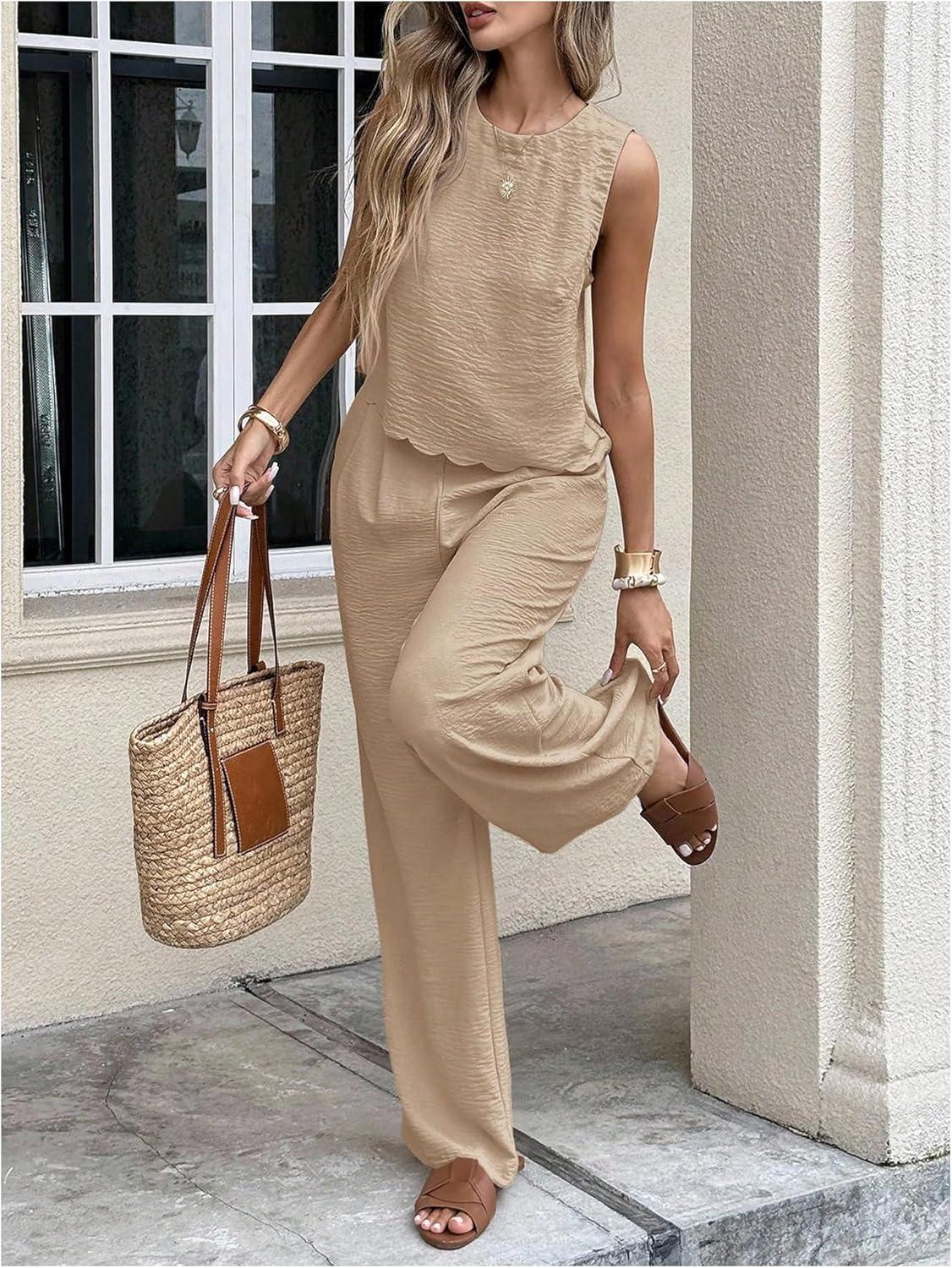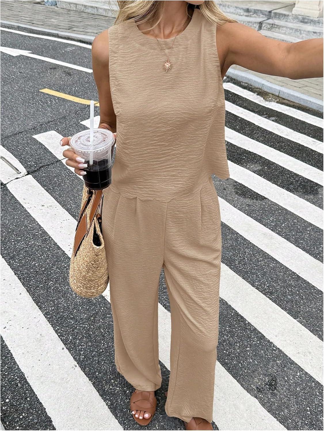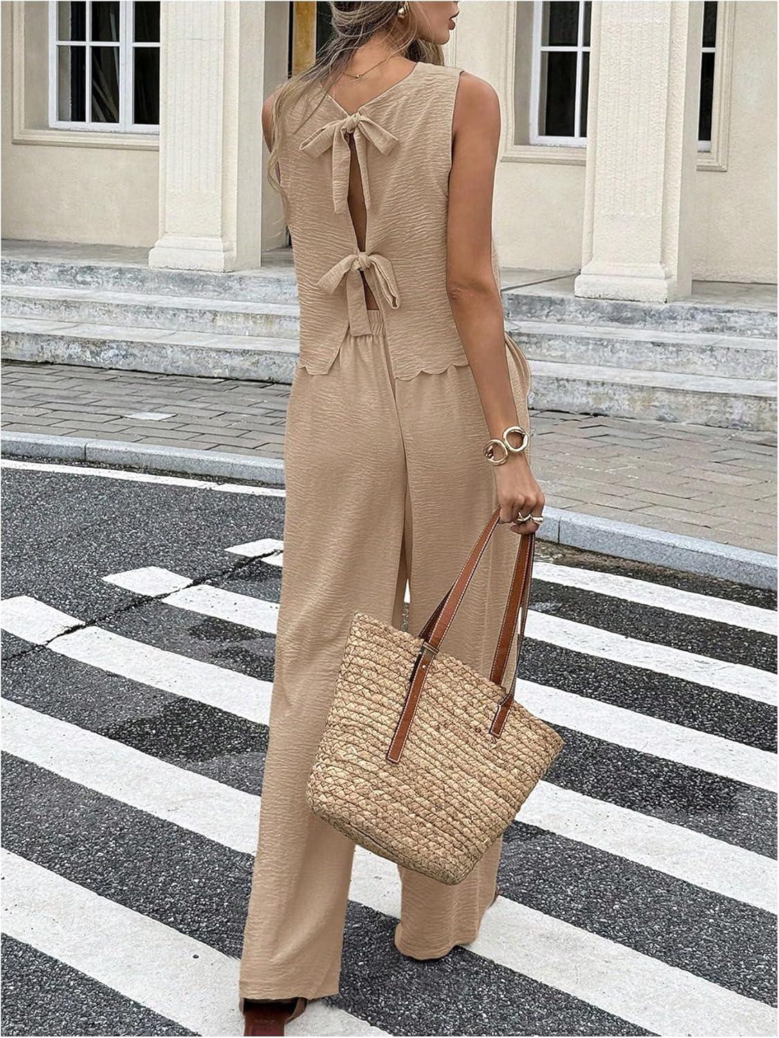 MakeMeChic Women’s 2 Piece Linen Outfit Bow Tie Back Crew Neck Tank Tops and Wide Leg Pants Set(Khaki)