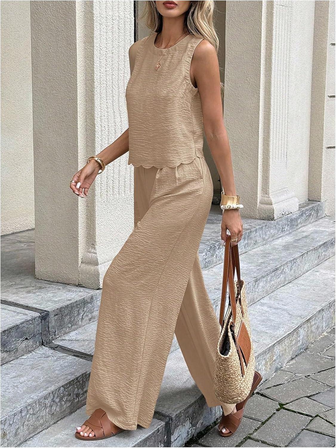 MakeMeChic Women's 2 Piece Linen Outfit Bow Tie Back Crew Neck Tank Tops and Wide Leg Pants Set(Khaki)