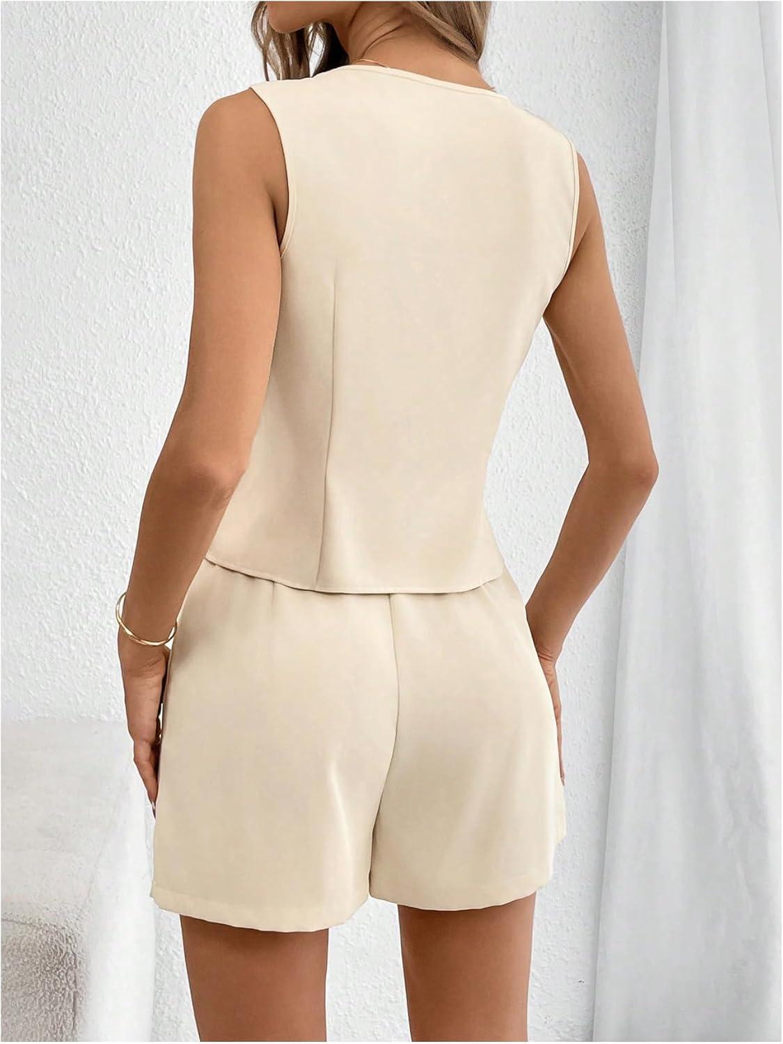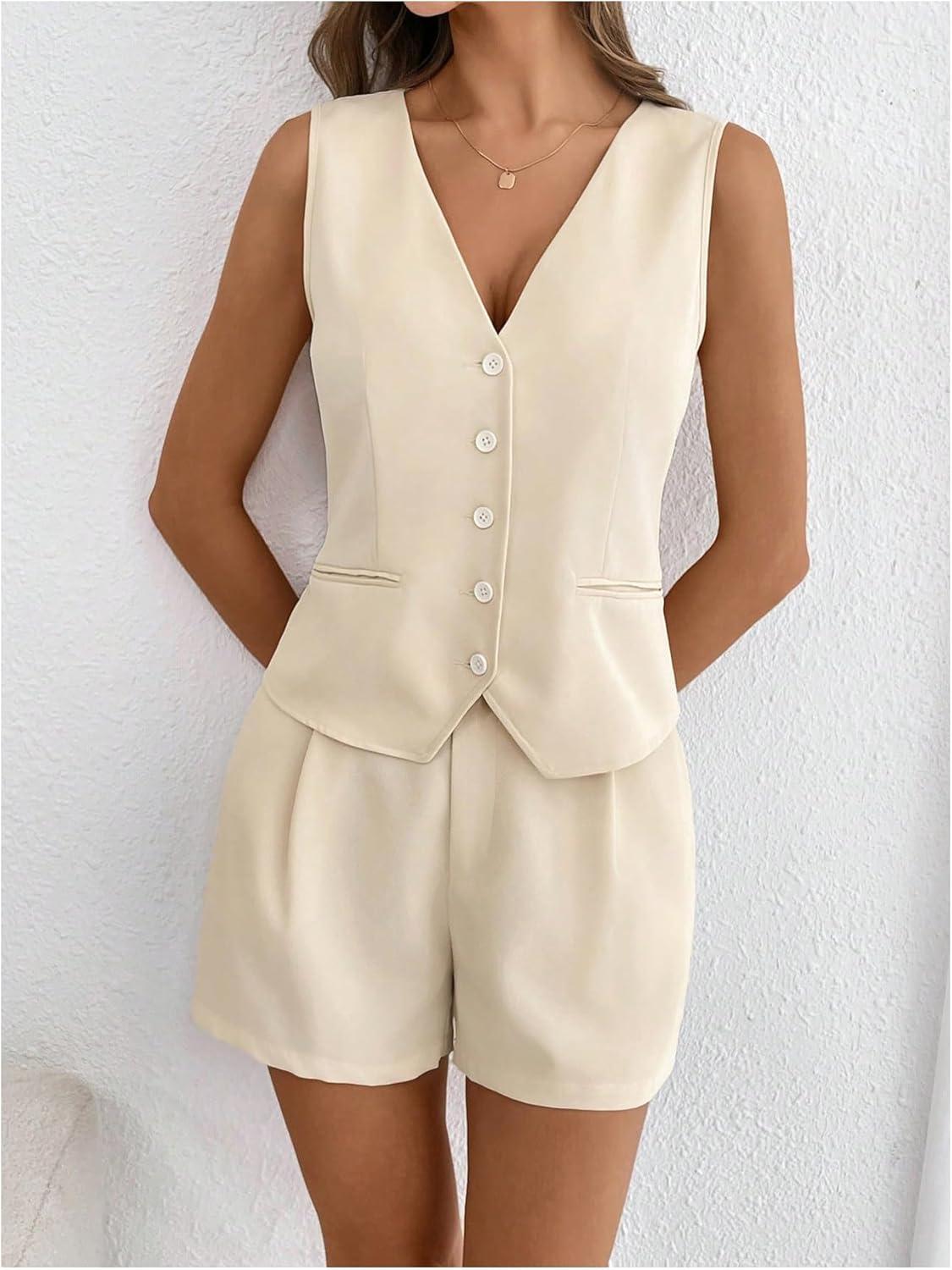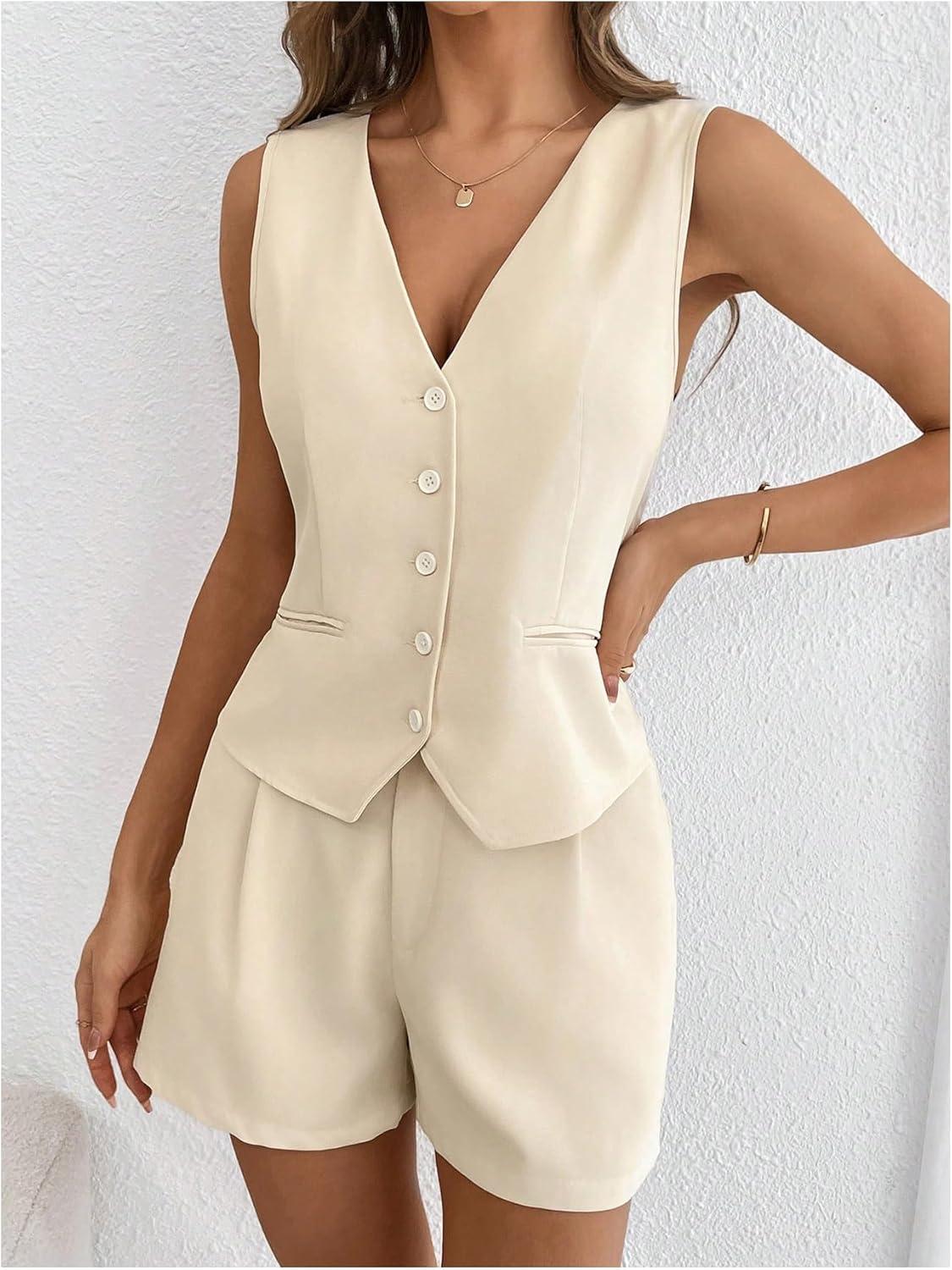 MakeMeChic Women’s 2 Piece Outfit Casual Button V Neck Blazer Vest and High Waisted Shorts Set(Apricot)
