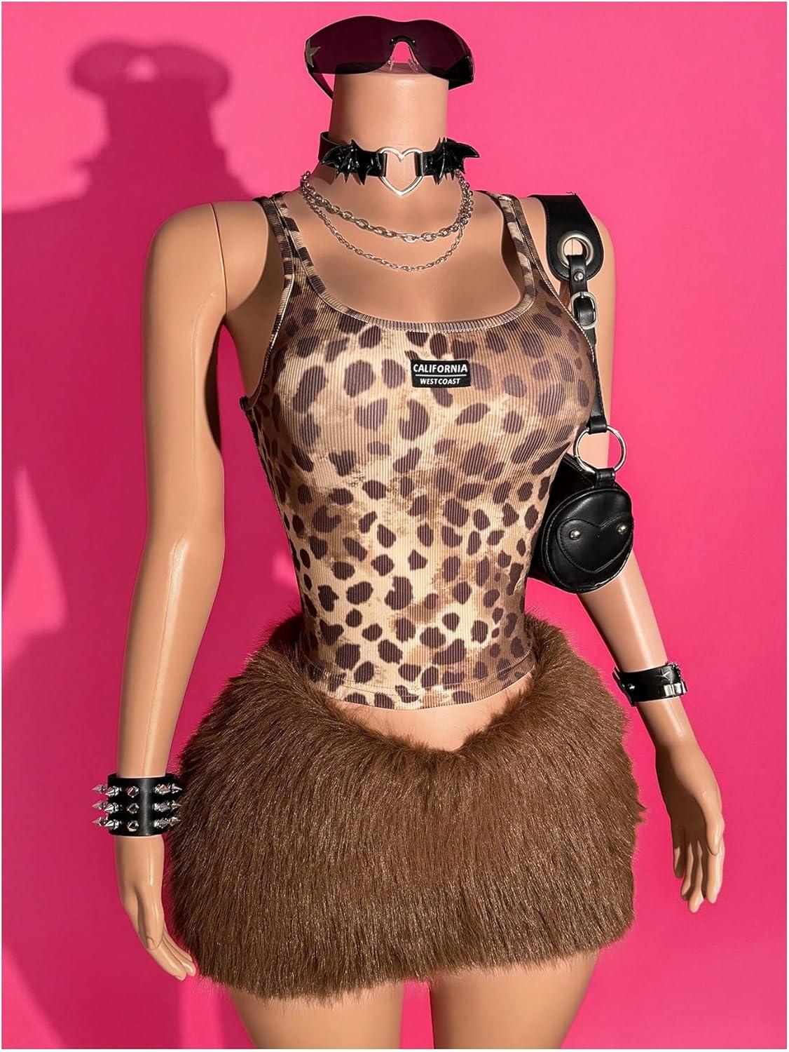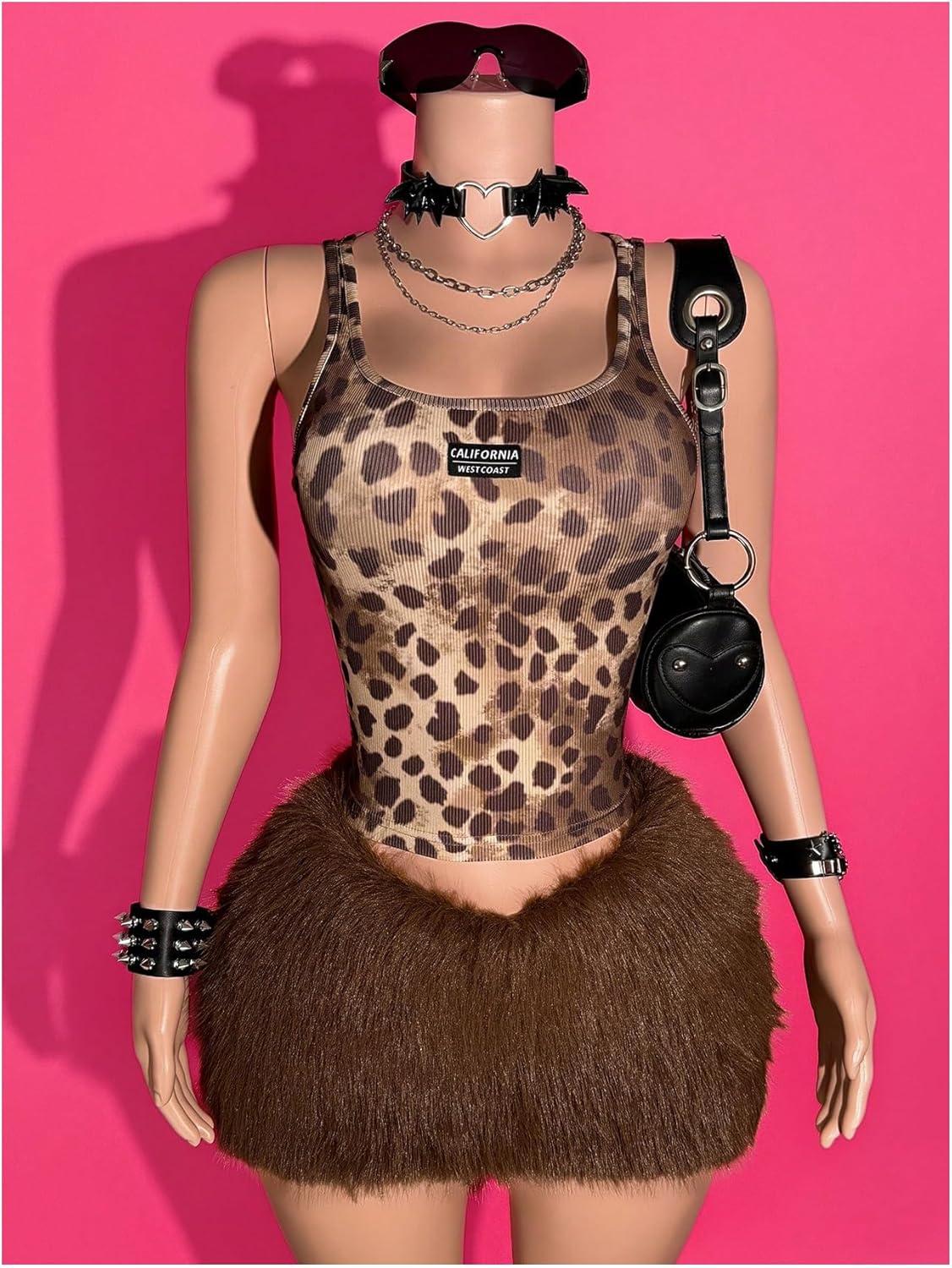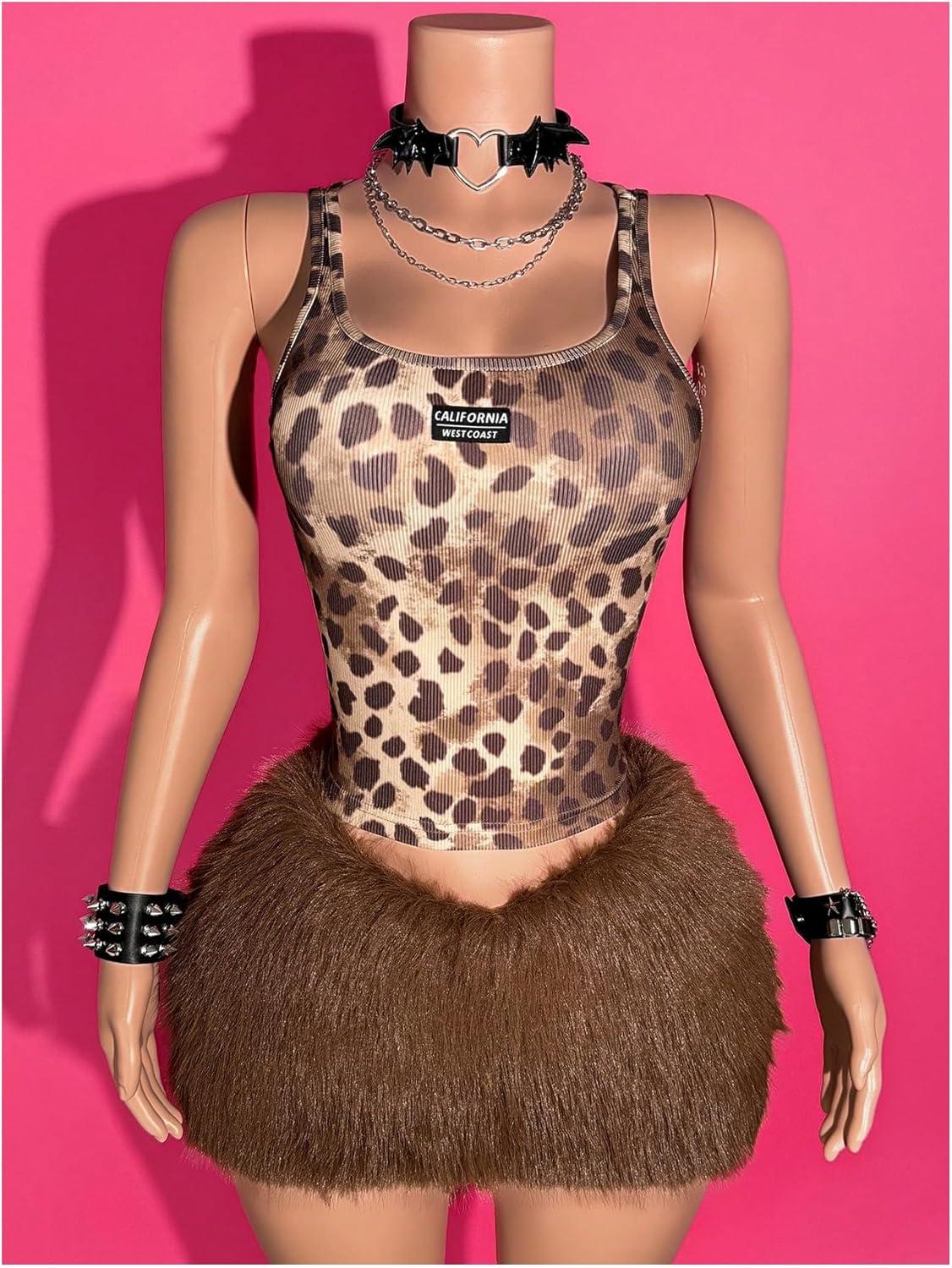 MakeMeChic Women’s 2 Piece Outfits Cheetah Print Crop Tank Top and Faux Fur Mini Skirt Clothing Set(Brown)