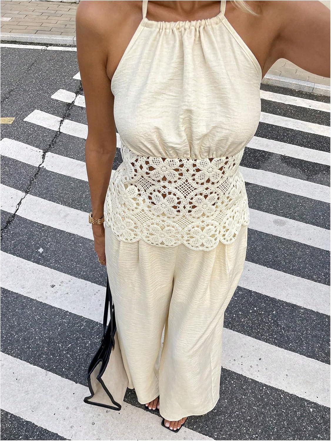 MakeMeChic Women's 2 Piece Summer Outfits Crochet Tie Back Halter Top and Pants Matching Sets(Apricot)
