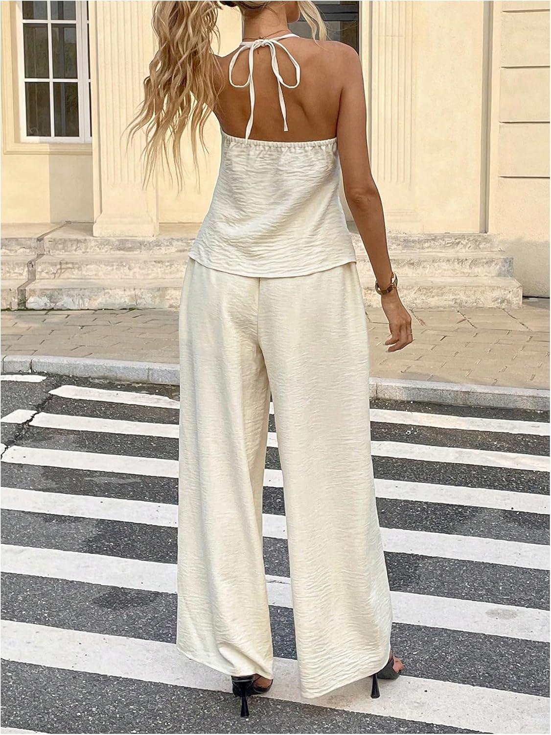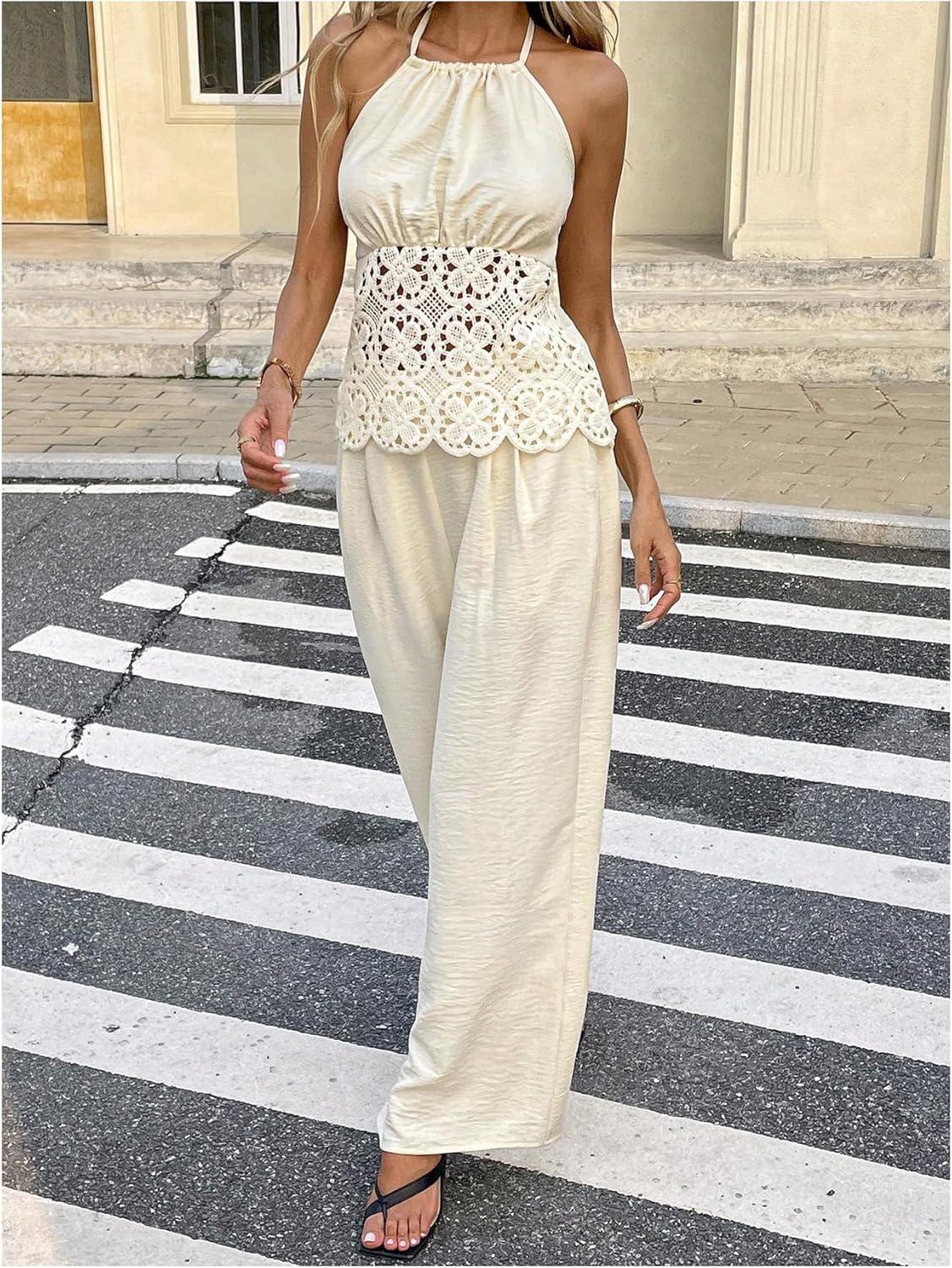 MakeMeChic Women’s 2 Piece Summer Outfits Crochet Tie Back Halter Top and Pants Matching Sets(Apricot)