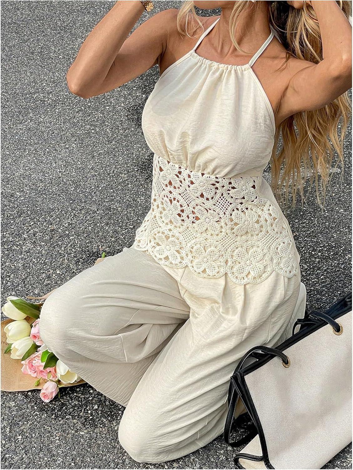 imageMakeMeChic Womens 2 Piece Summer Outfits Crochet Tie Back Halter Top and Pants Matching SetsApricot