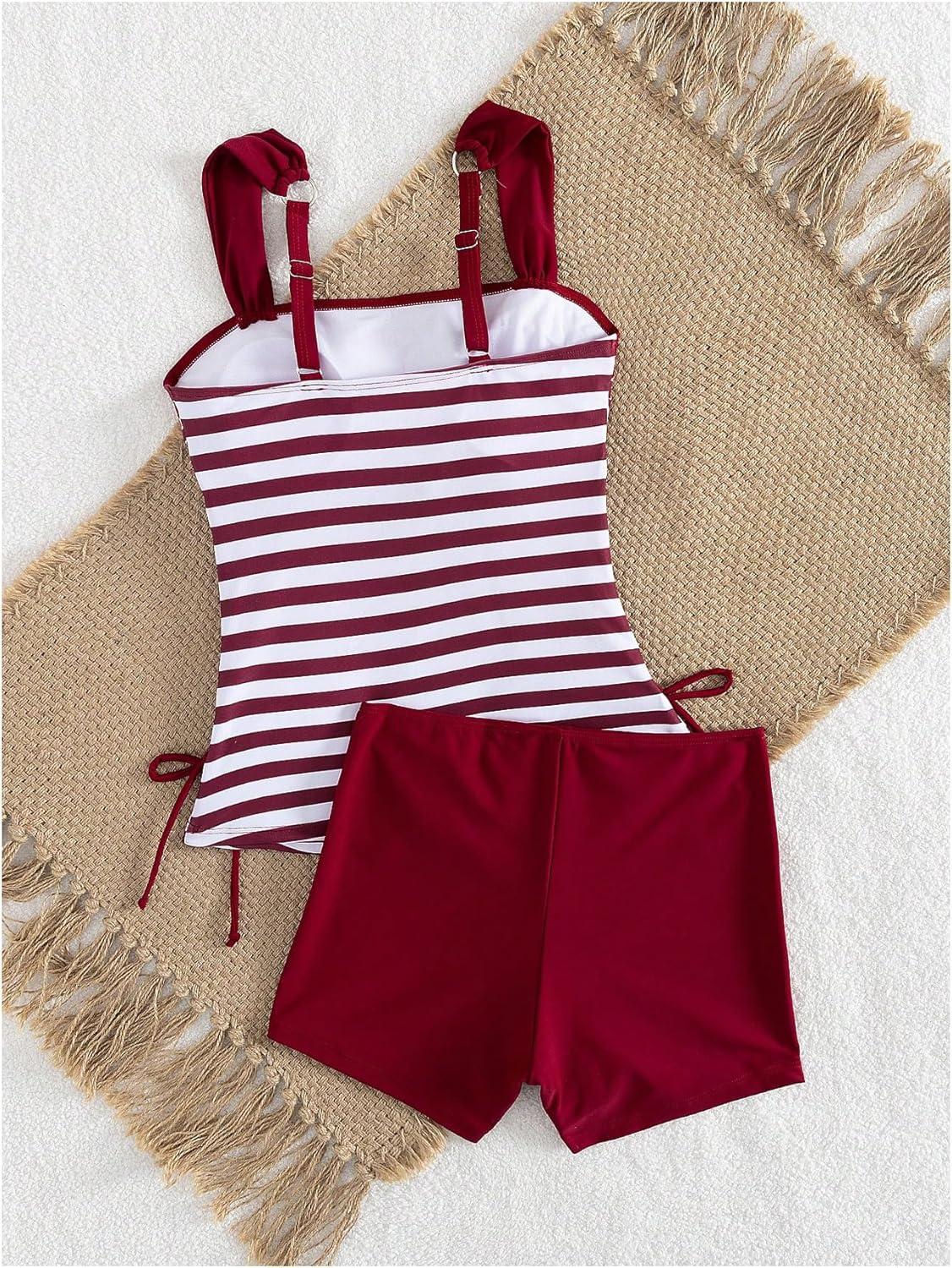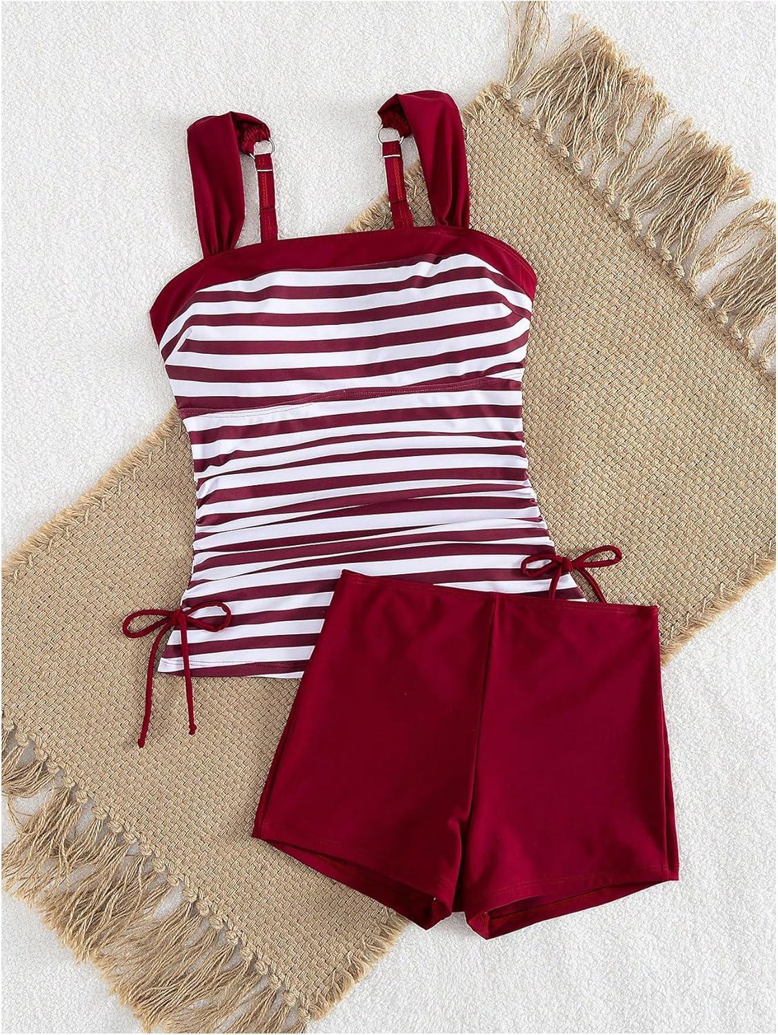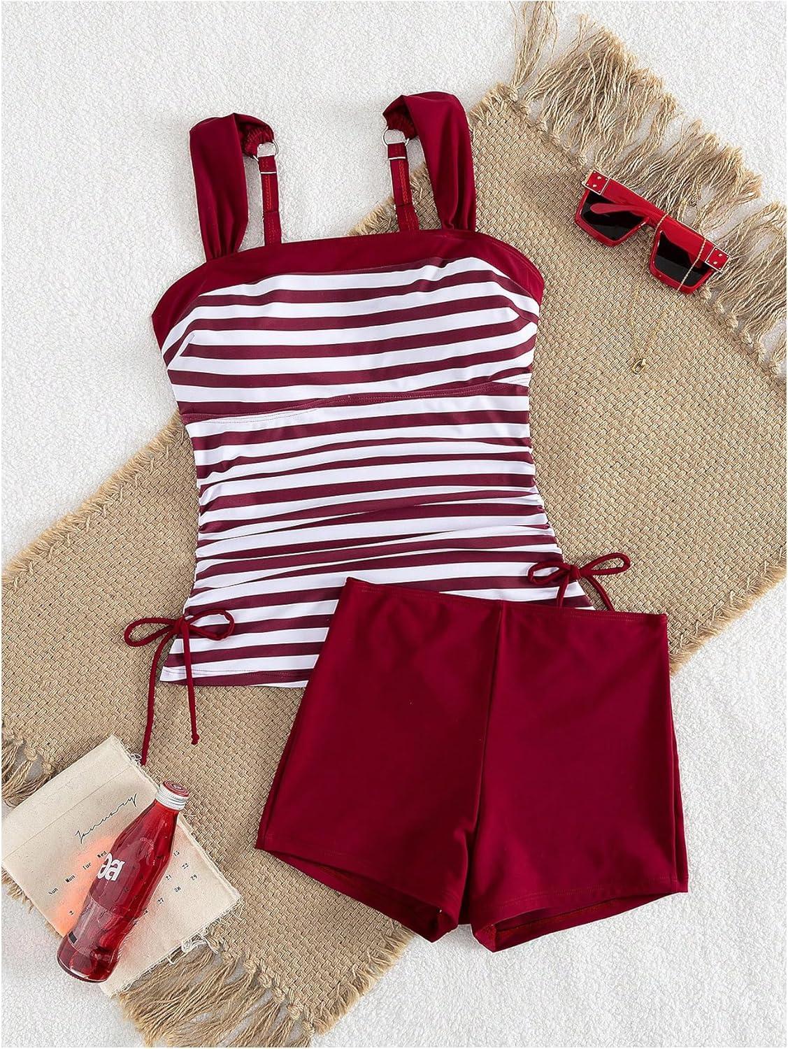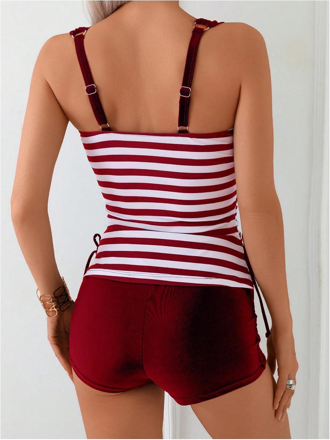 MakeMeChic Women's 2 Piece Tankini Swimsuit Striped Drawstring High Waisted Tummy Control Swimsuit(Red and White)