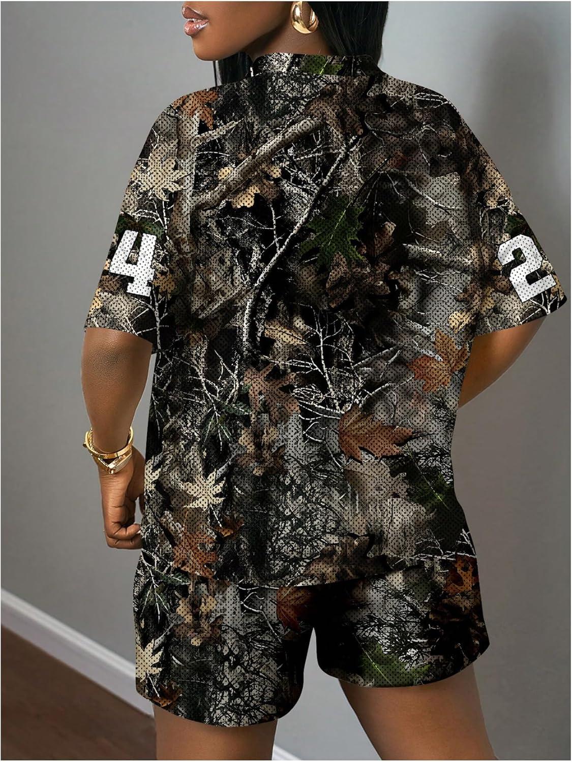 MakeMeChic Women’s 2 Piece Y2k Outfit Camo Number Print V Neck Jersey Tops and Shorts Set(Multicolor)