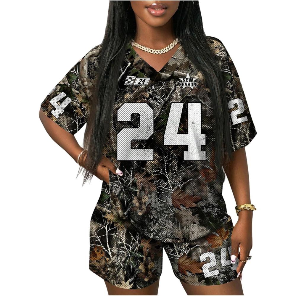 MakeMeChic Women's 2 Piece Y2k Outfit Camo Number Print V Neck Jersey Tops and Shorts Set(Multicolor)