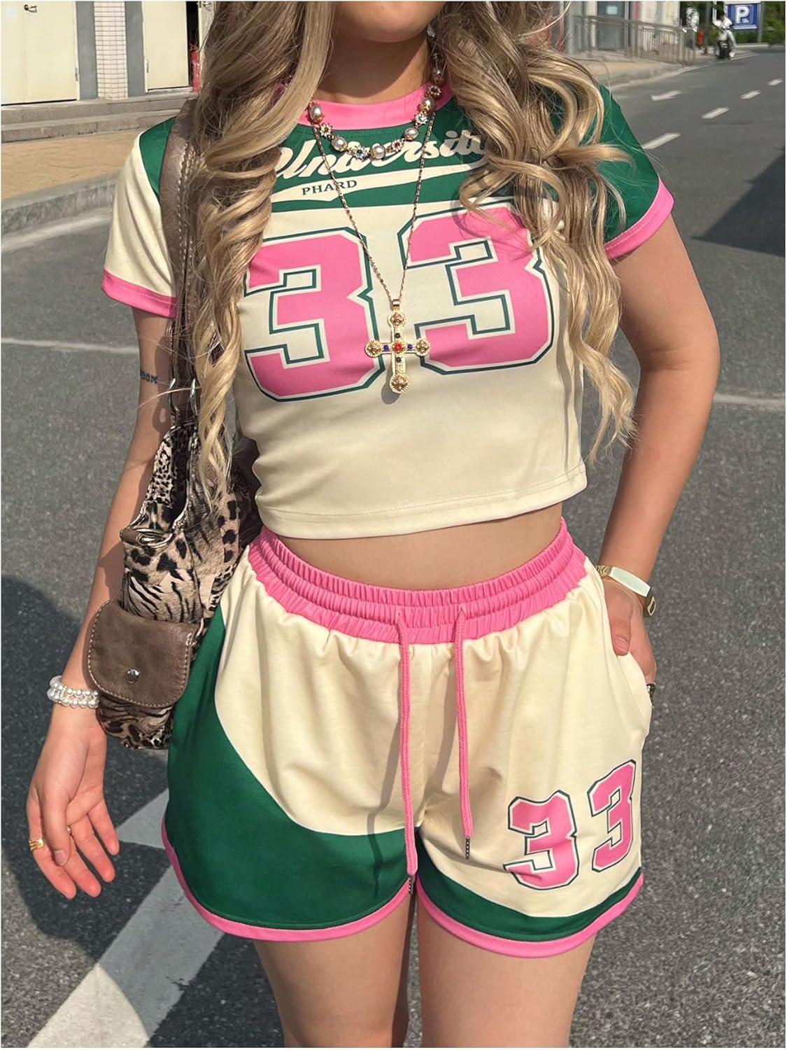 MakeMeChic Women’s 2 Piece Y2k Outfit Letter Print Crew Neck Crop Tops and Shorts Set(Multicolor)