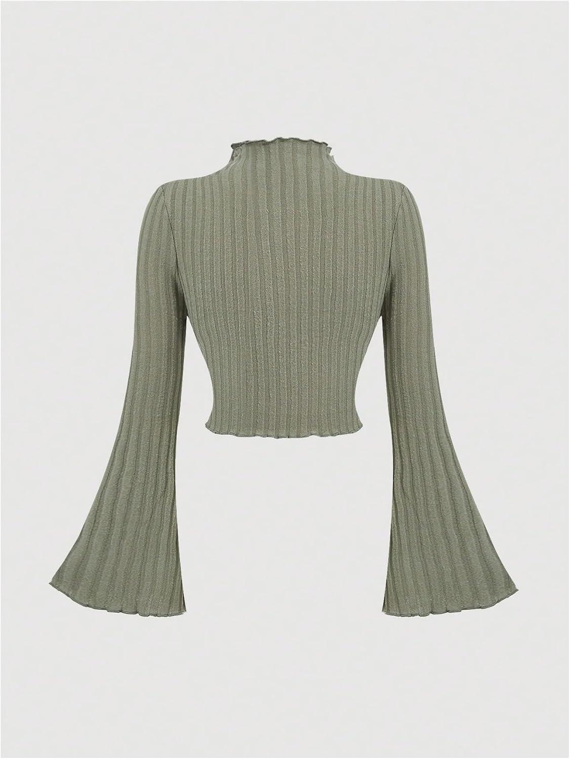 MakeMeChic Women's Bell Sleeve Crop Top Mock Neck Knit Lettuce Trim Rib Tee Shirt Tops(Army Green)