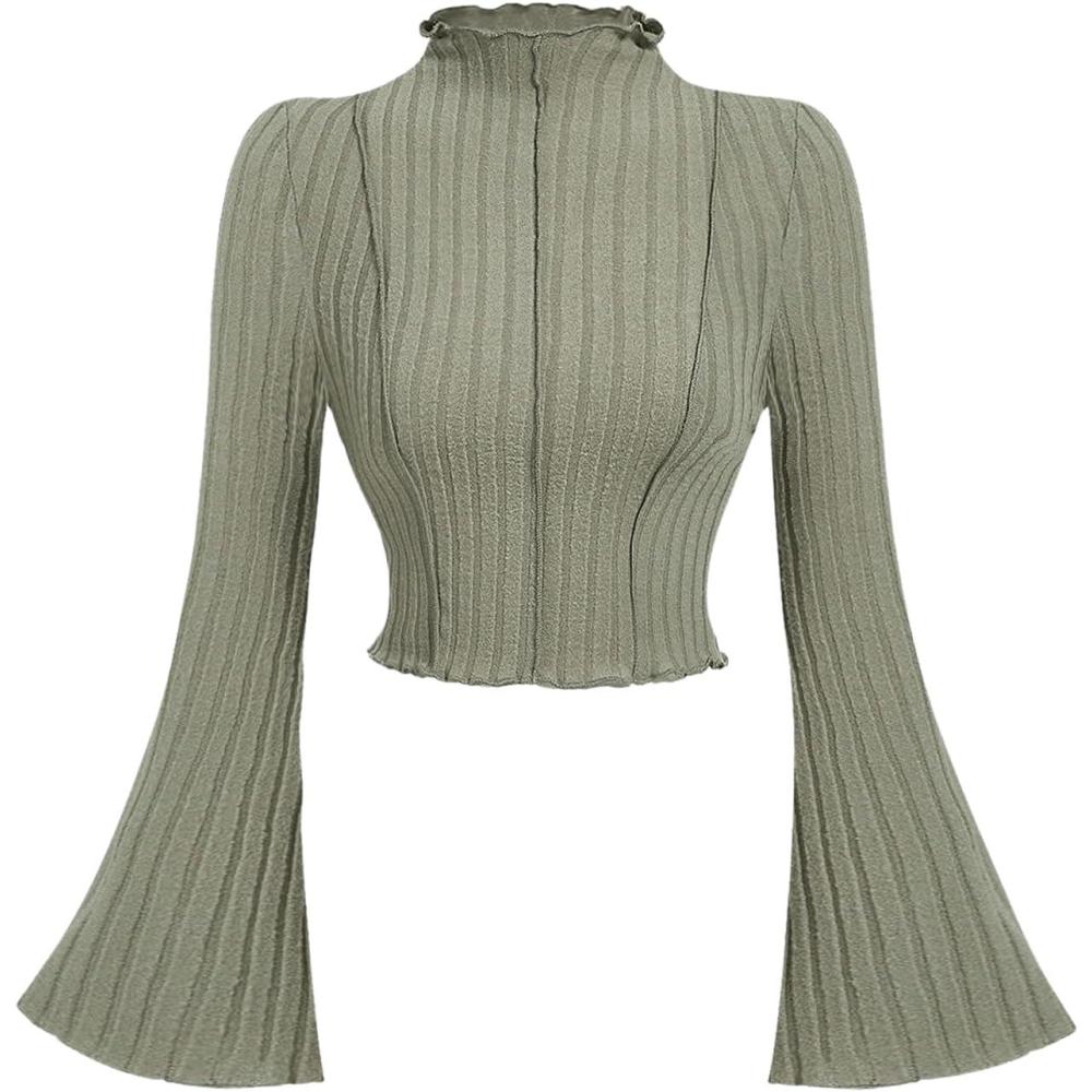 MakeMeChic Women’s Bell Sleeve Crop Top Mock Neck Knit Lettuce Trim Rib Tee Shirt Tops(Army Green)