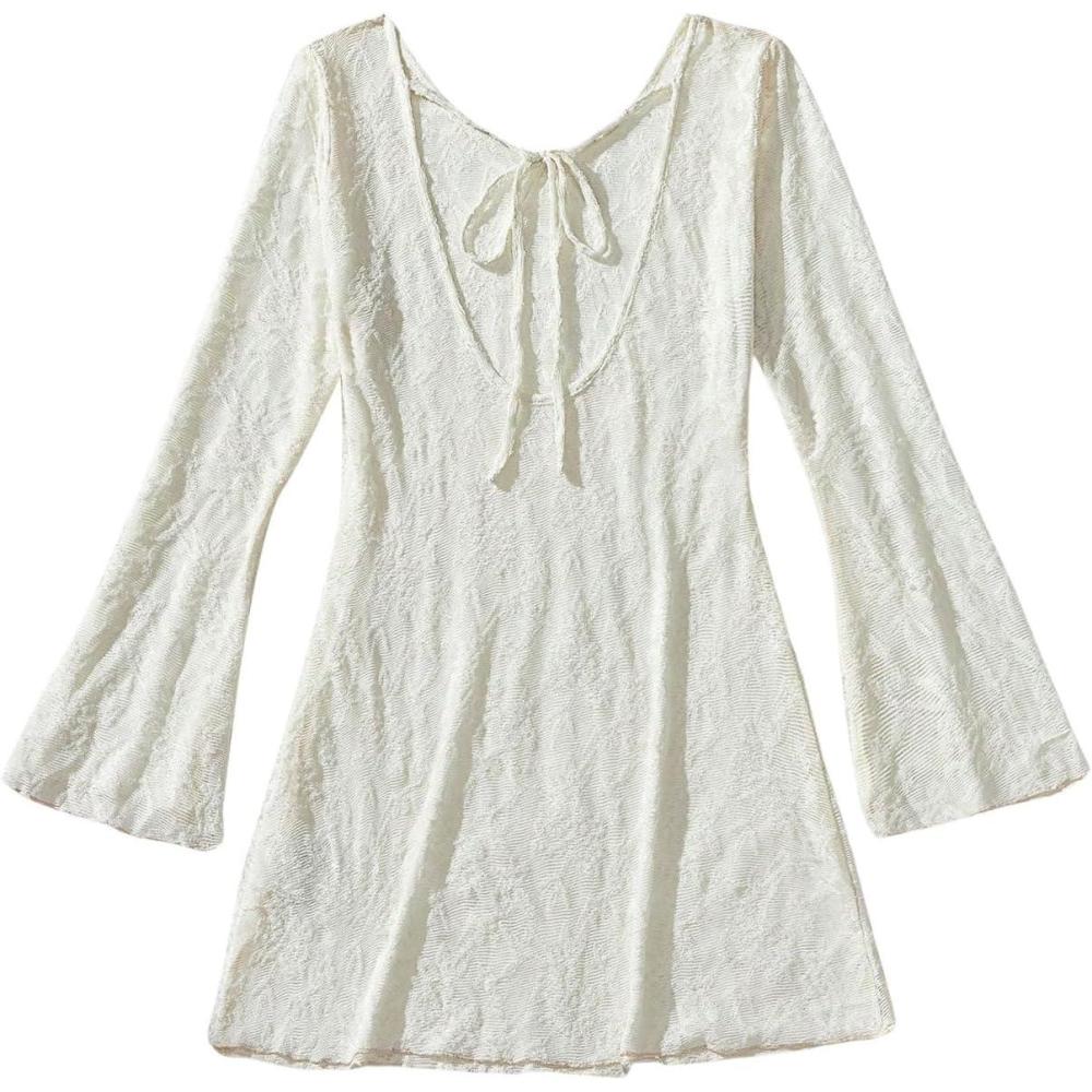 MakeMeChic Women's Bell Sleeve Scoop Neck Tie Front Lace Beach Swim Dress Summer Cover Up