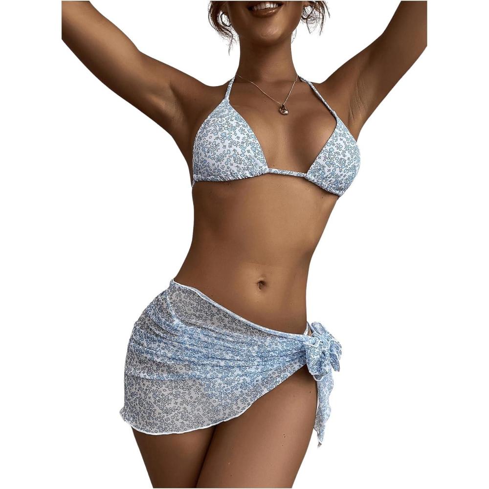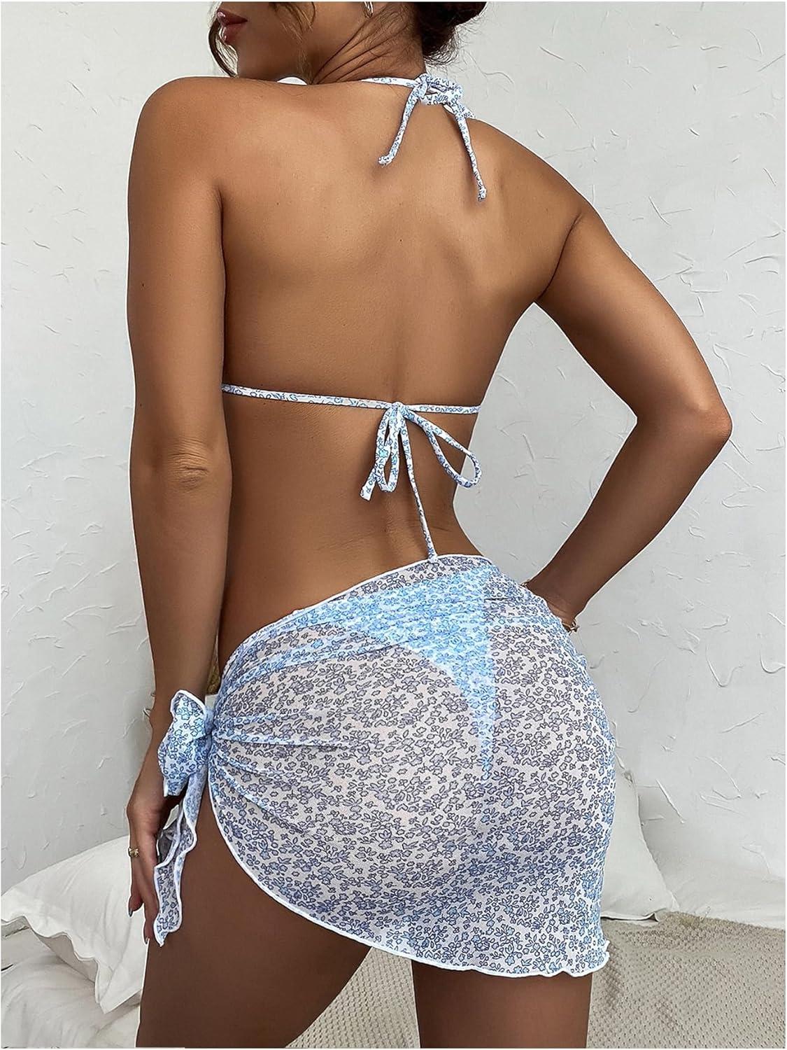 MakeMeChic Women's Bikini Sets Floral Print Triangle Halter Tie Back Beach Swimsuit(Blue and White)