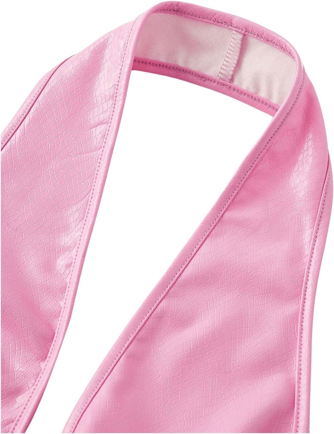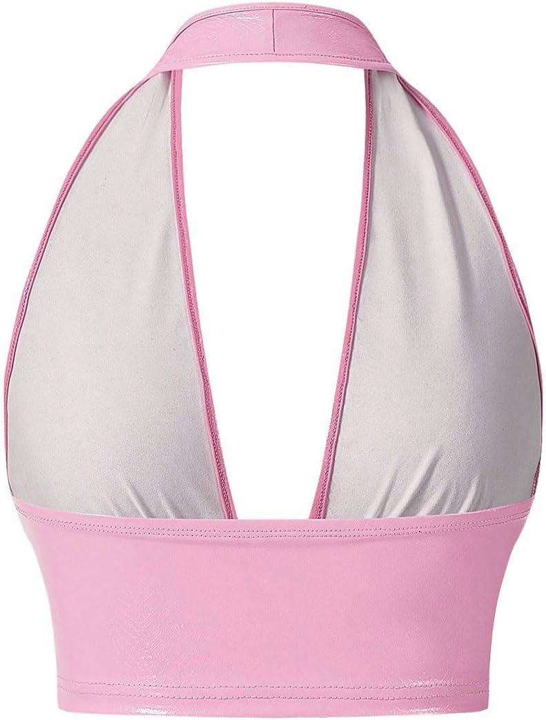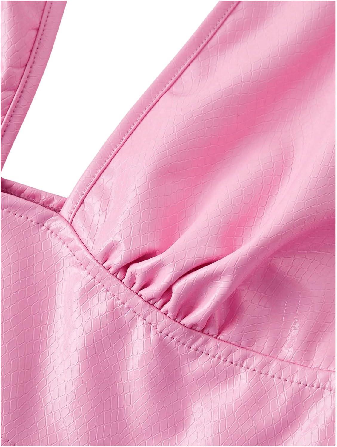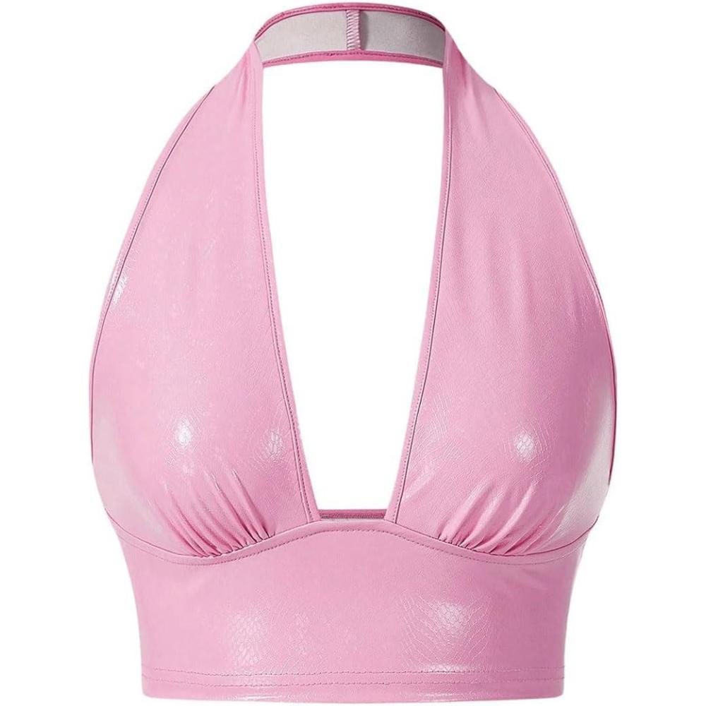 MakeMeChic Women’s Black Leather Top Party Deep V Neck Sleeveless Backless Crop Halter Tops(Pink)