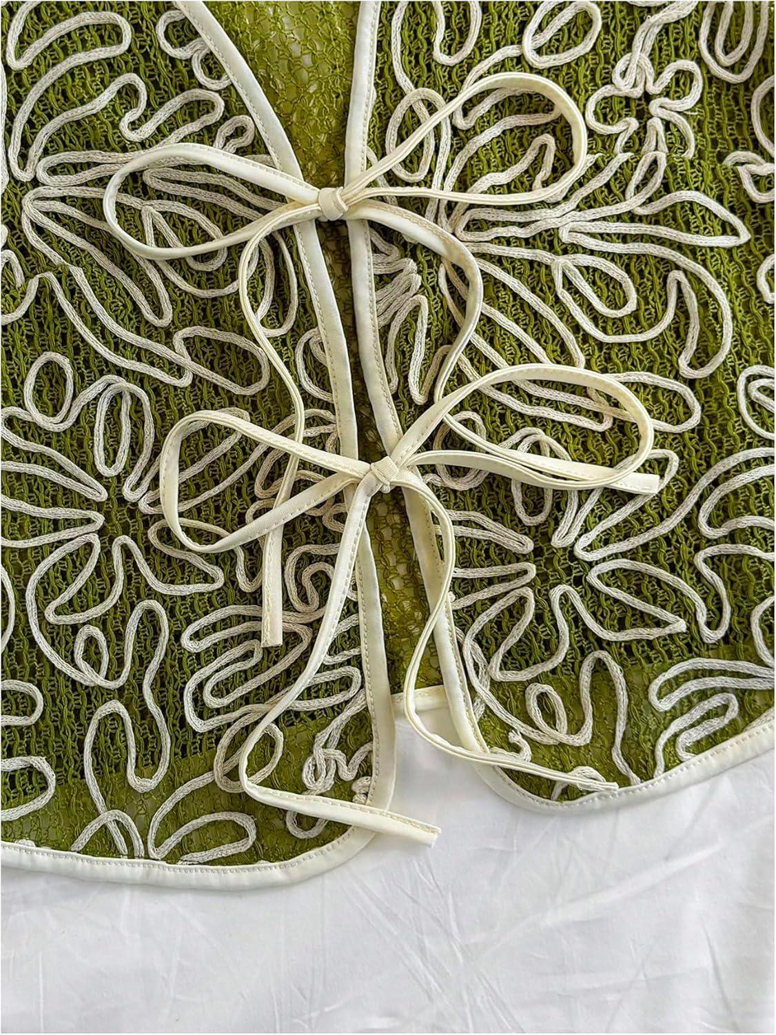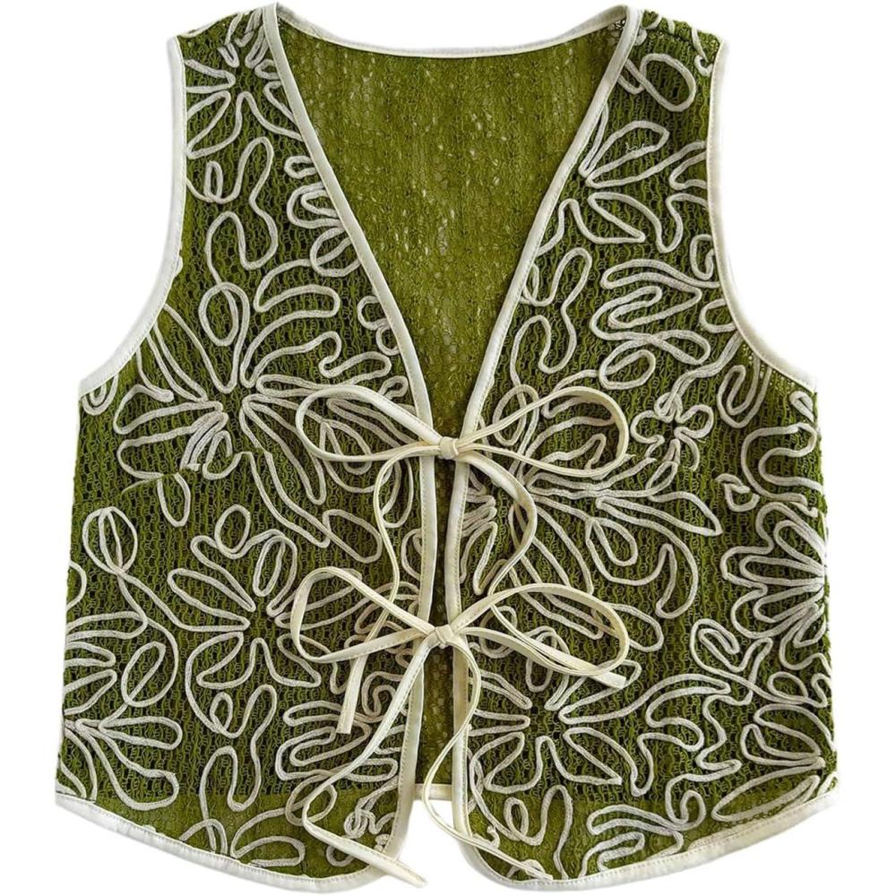 MakeMeChic Women's Boho Floral Vests Tie Front V Neck Contrast Binding Sleeveless Outwear Vest Top(Green)