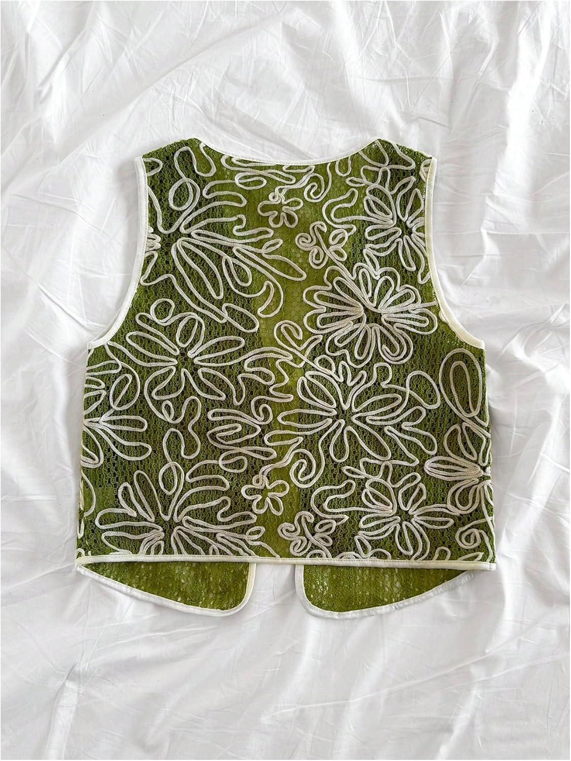 MakeMeChic Women’s Boho Floral Vests Tie Front V Neck Contrast Binding Sleeveless Outwear Vest Top(Green)