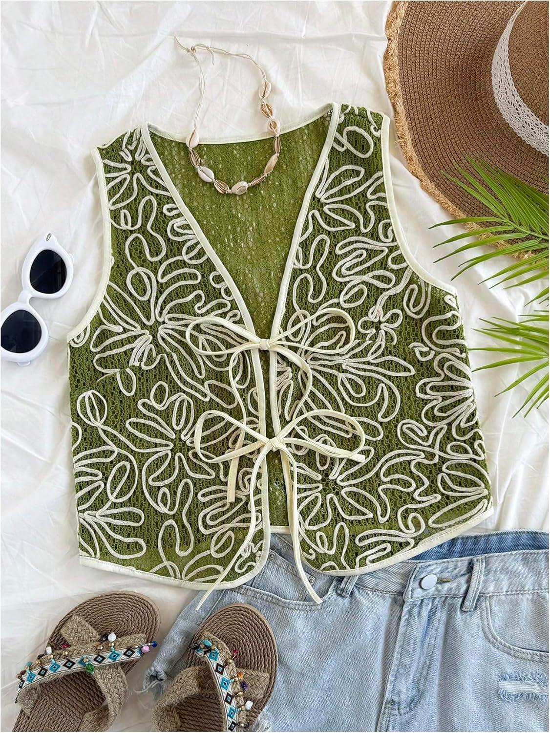 imageMakeMeChic Womens Boho Floral Vests Tie Front V Neck Contrast Binding Sleeveless Outwear Vest TopGreen