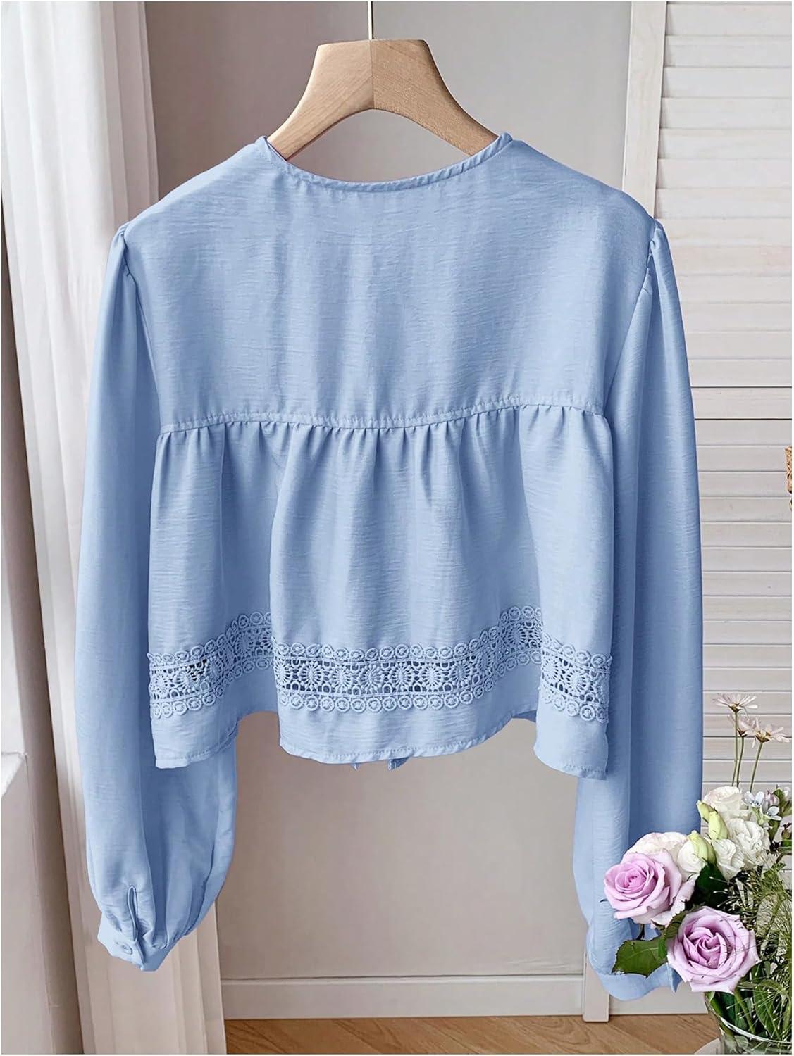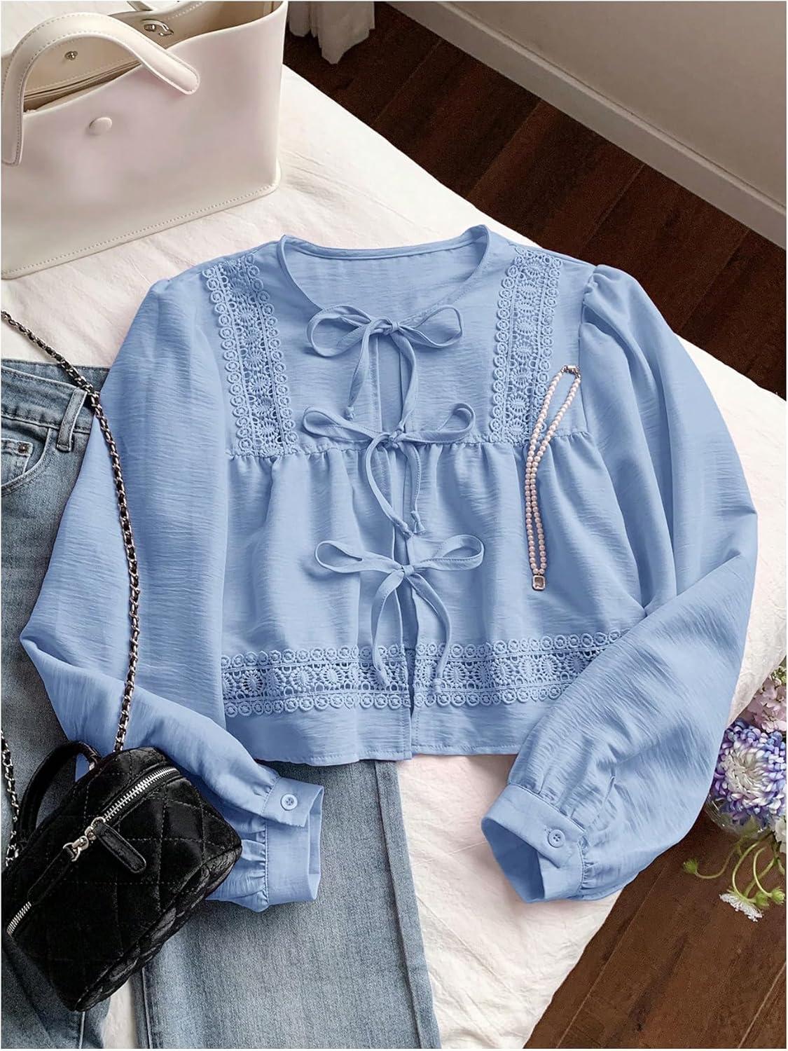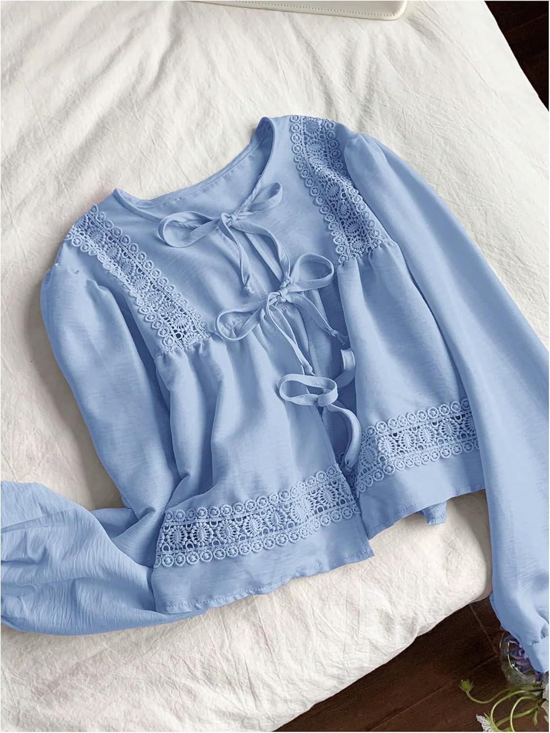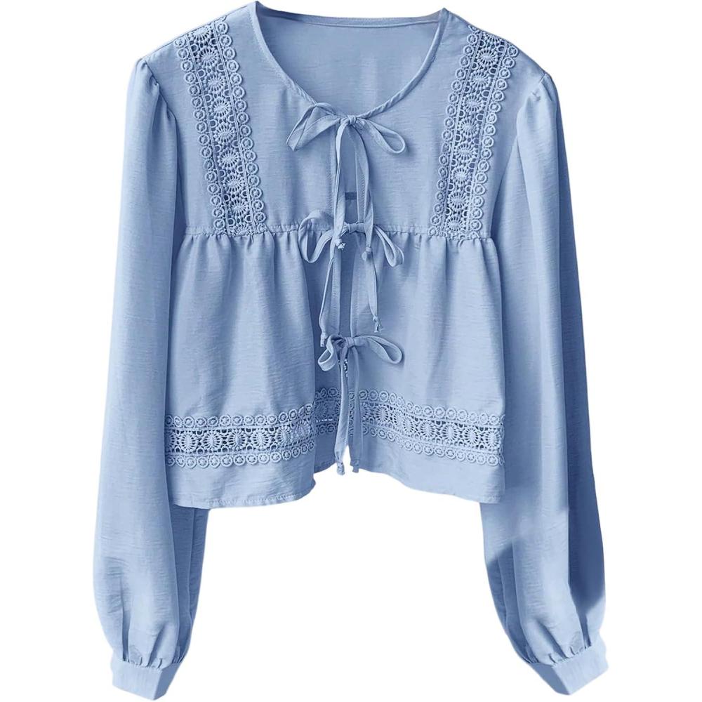 MakeMeChic Women’s Boho Top Peplum Long Sleeve Shirt Tie Front Crew Neck Summer Blouse(Blue)