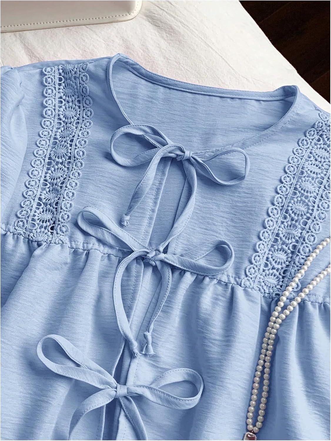 MakeMeChic Women’s Bow Tie Front Blouse Eyelet Embroidery V Neck Shirt Ruffle Hem Sleeveless Summer Dressy Tops(Blue)