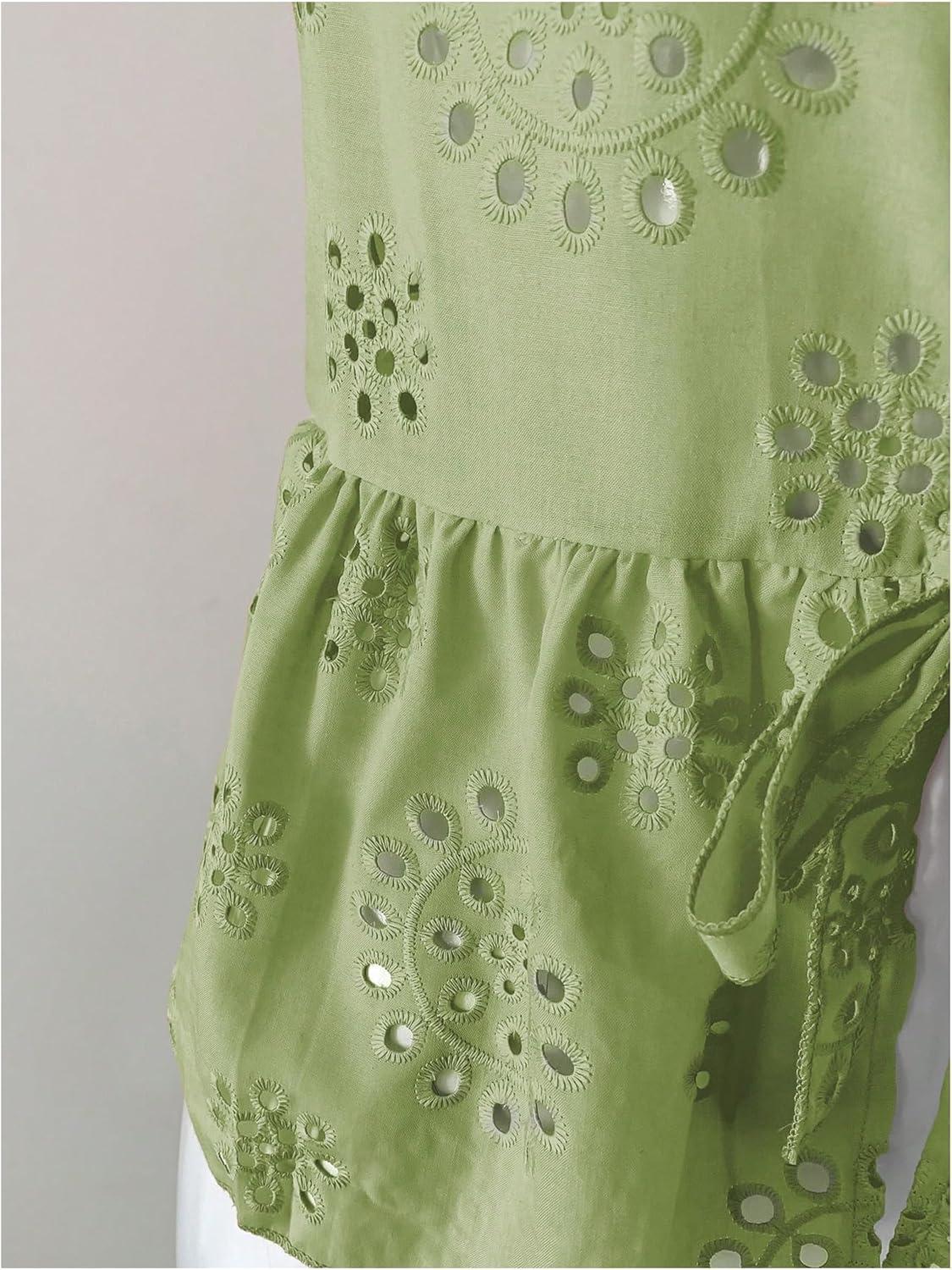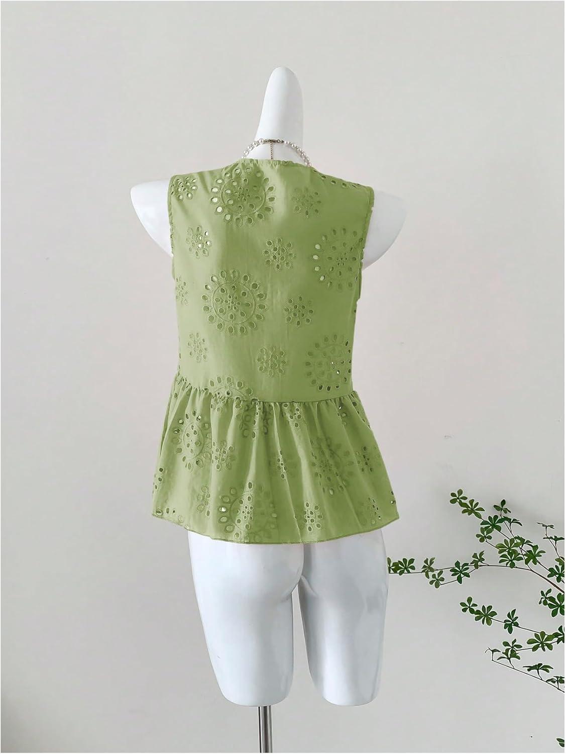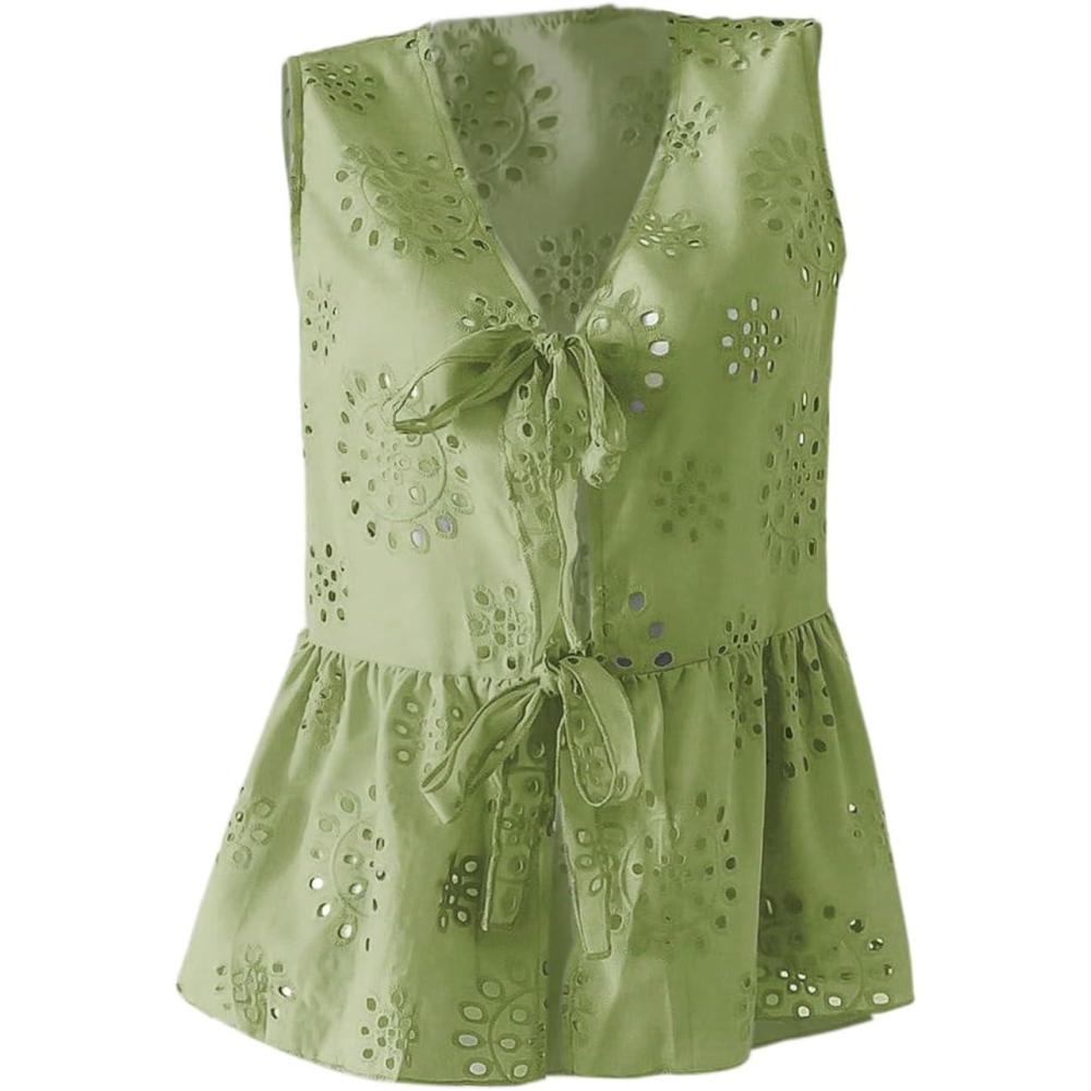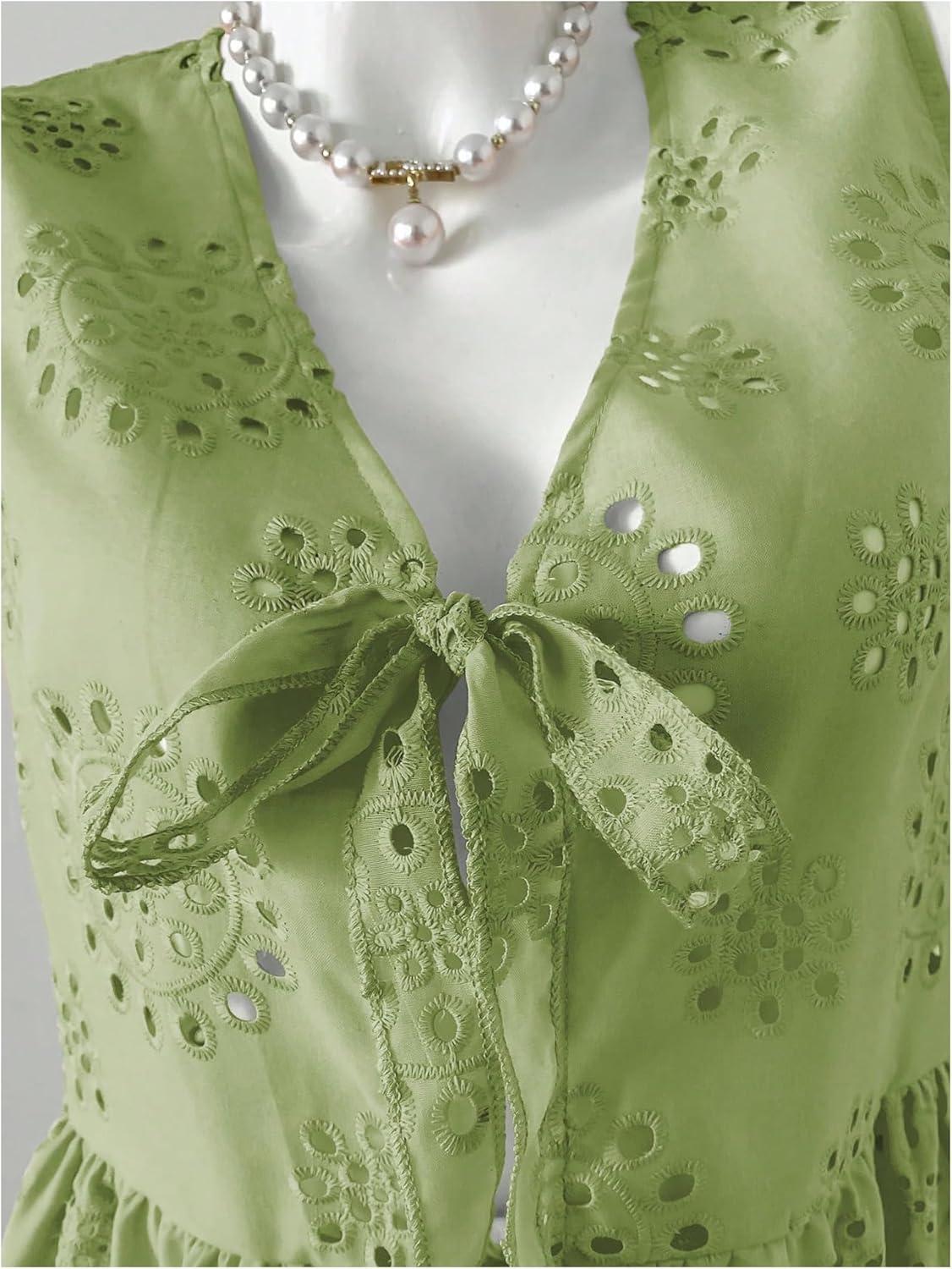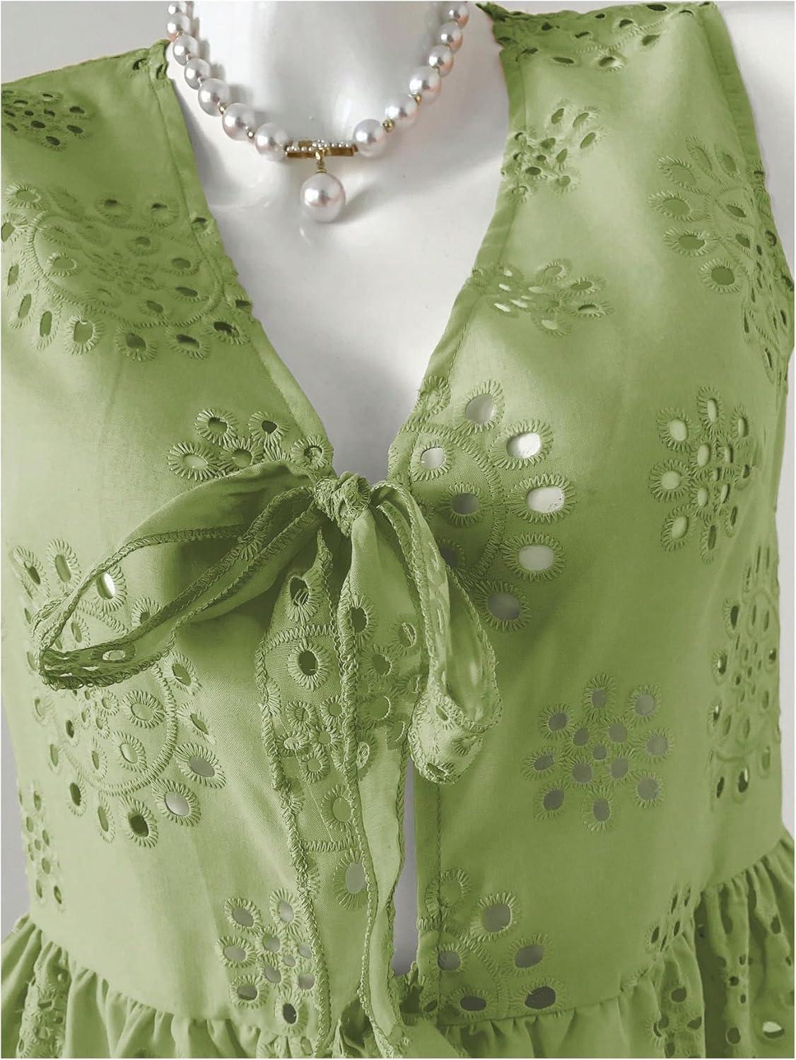 MakeMeChic Women’s Bow Tie Front Blouse Eyelet Embroidery V Neck Shirt Ruffle Hem Sleeveless Summer Dressy Tops(Mint Green)