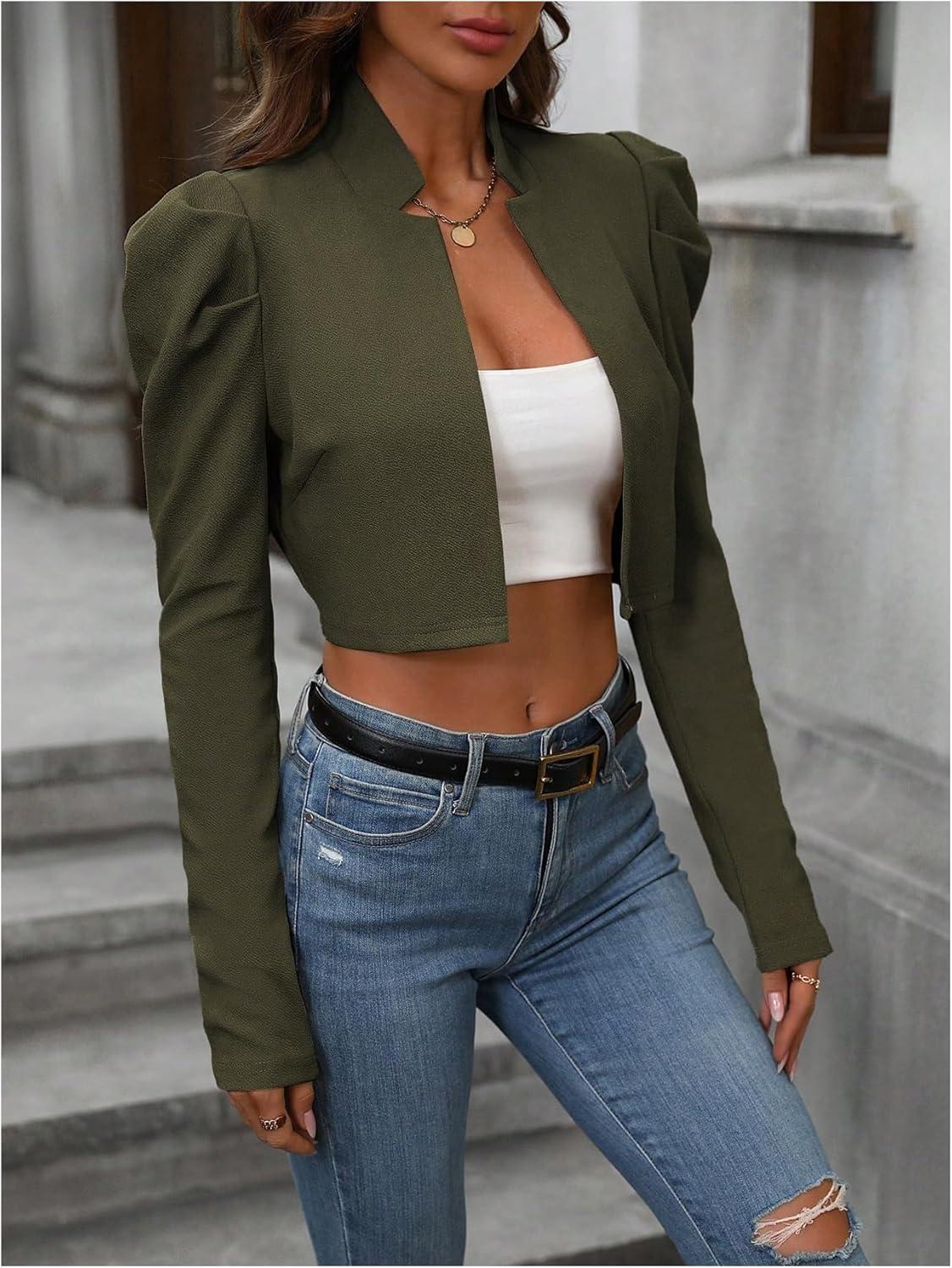 MakeMeChic Women’s Business Casual Blazers Long Puff Sleeve Open Front Work Office Cropped Blazer Suit Jacket(Army Green)