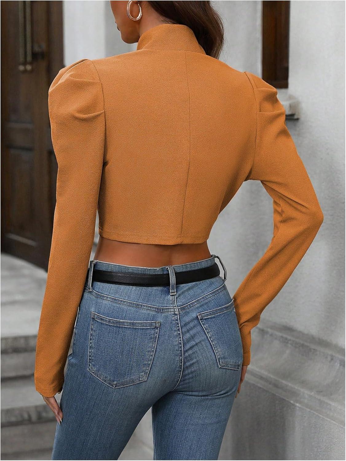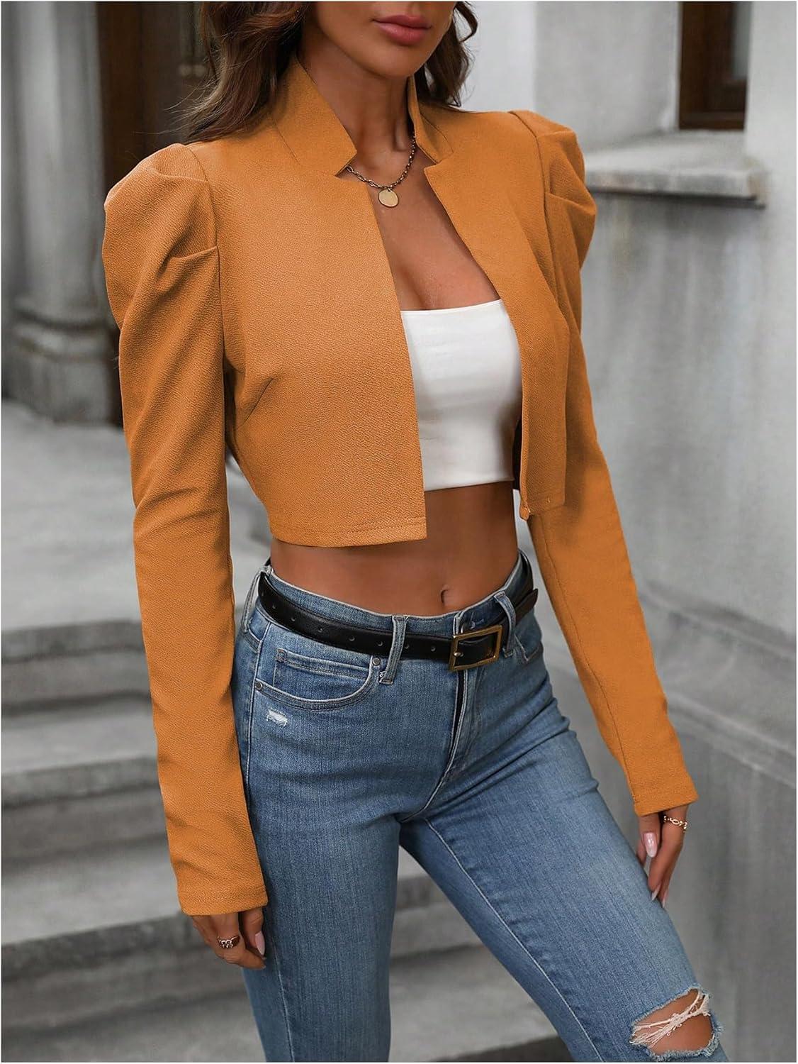 MakeMeChic Women's Business Casual Blazers Long Puff Sleeve Open Front Work Office Cropped Blazer Suit Jacket(Mustard Yellow)