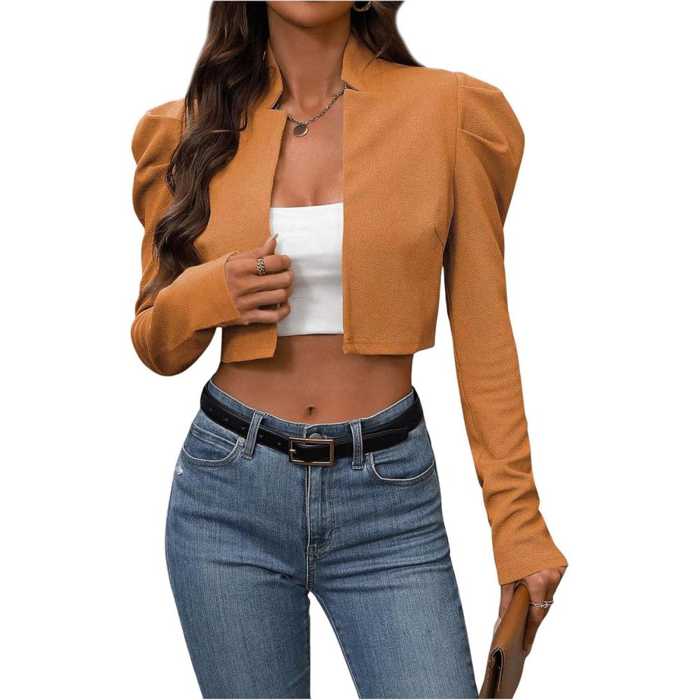 MakeMeChic Women’s Business Casual Blazers Long Puff Sleeve Open Front Work Office Cropped Blazer Suit Jacket(Mustard Yellow)