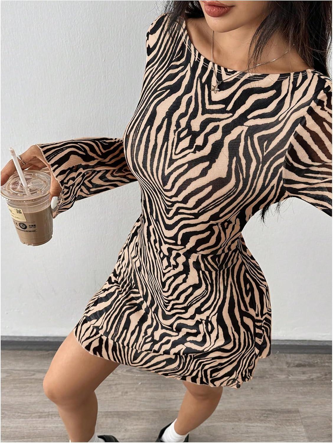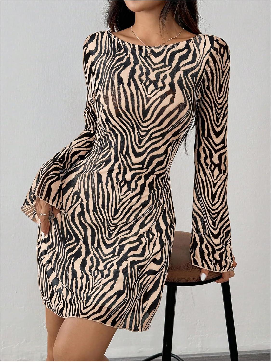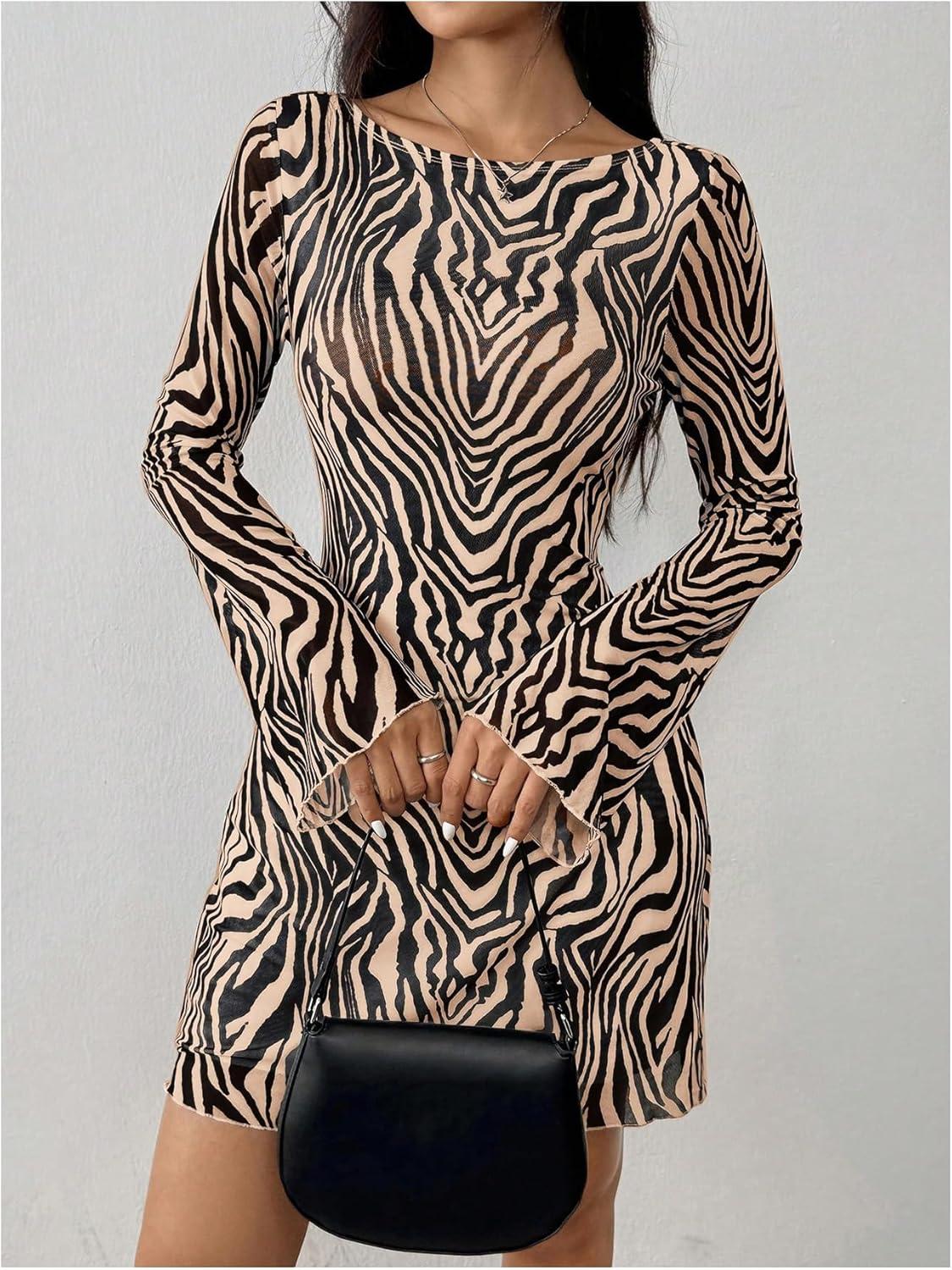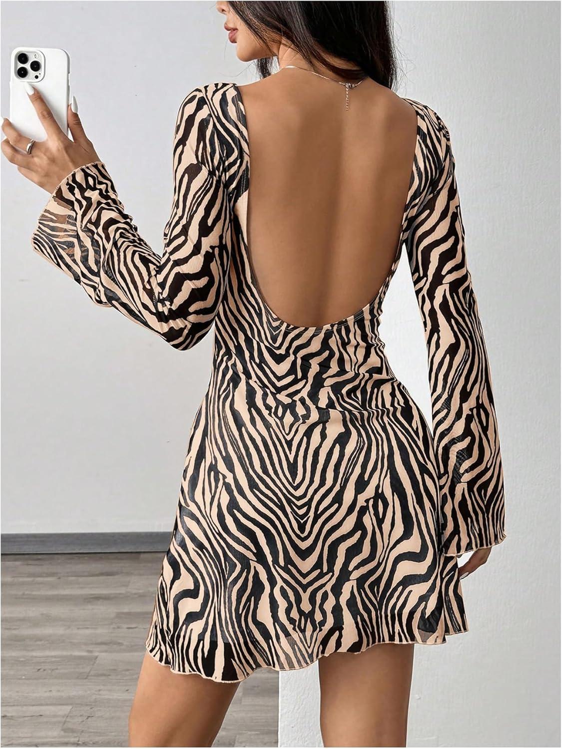 MakeMeChic Women's Cheetah Print Mini Dress Y2k Bell Sleeve Leopard Print Dress Going Out Outfits(Zebra Brown)