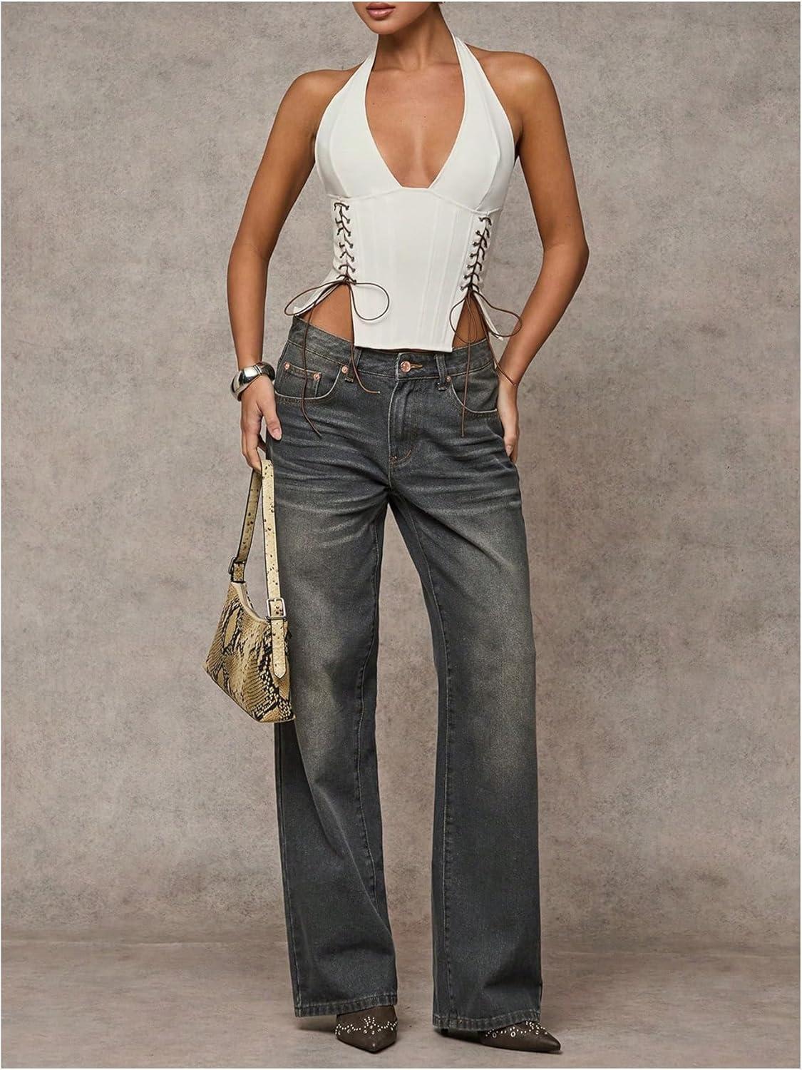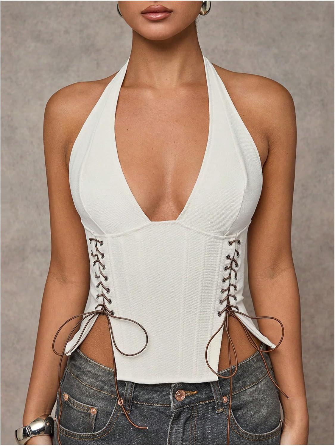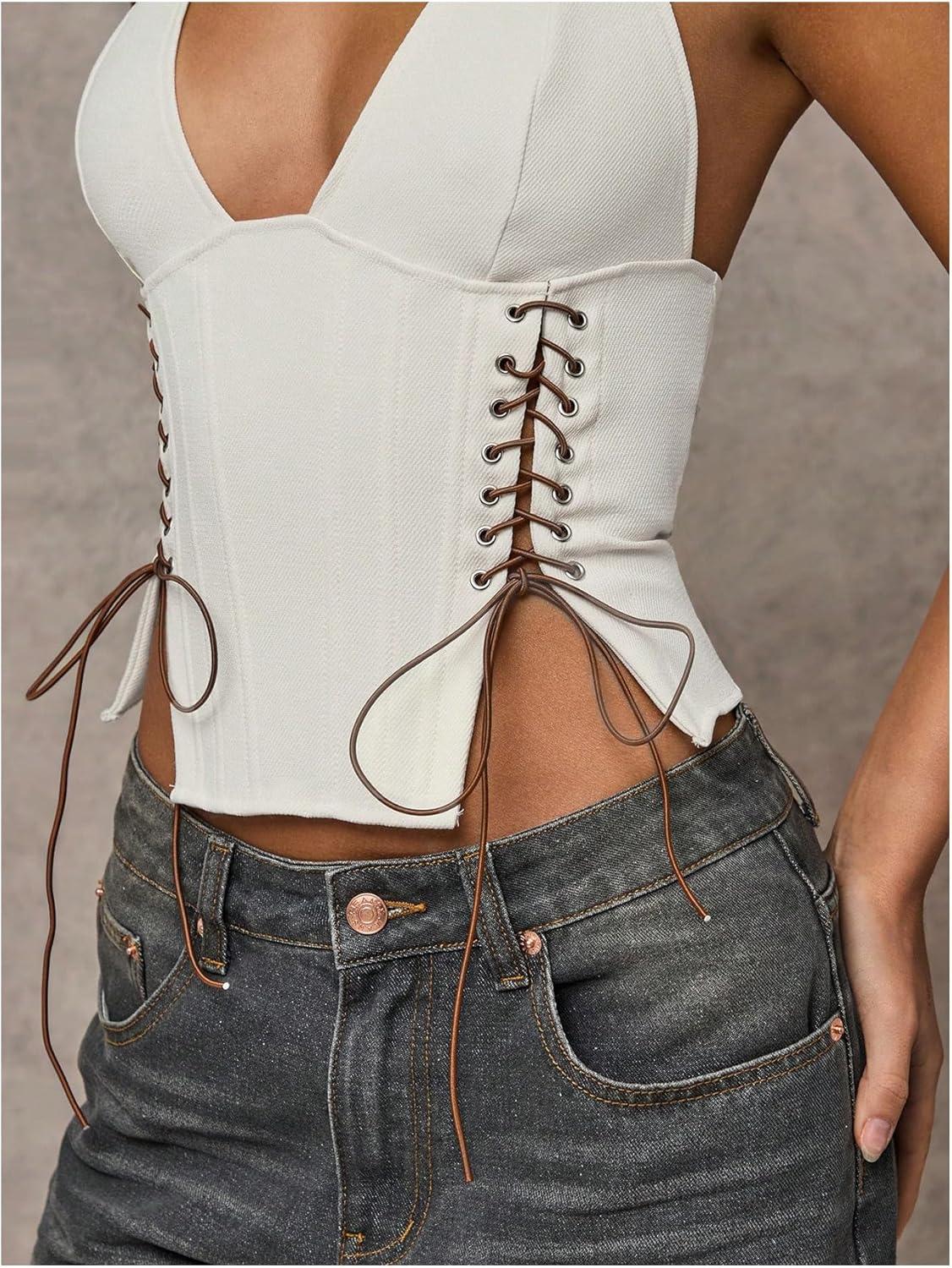 MakeMeChic Women’s Corset Halter Tops Halloween Lace Up Corset Tops Y2K Cowgirl Crop Top(Light White)