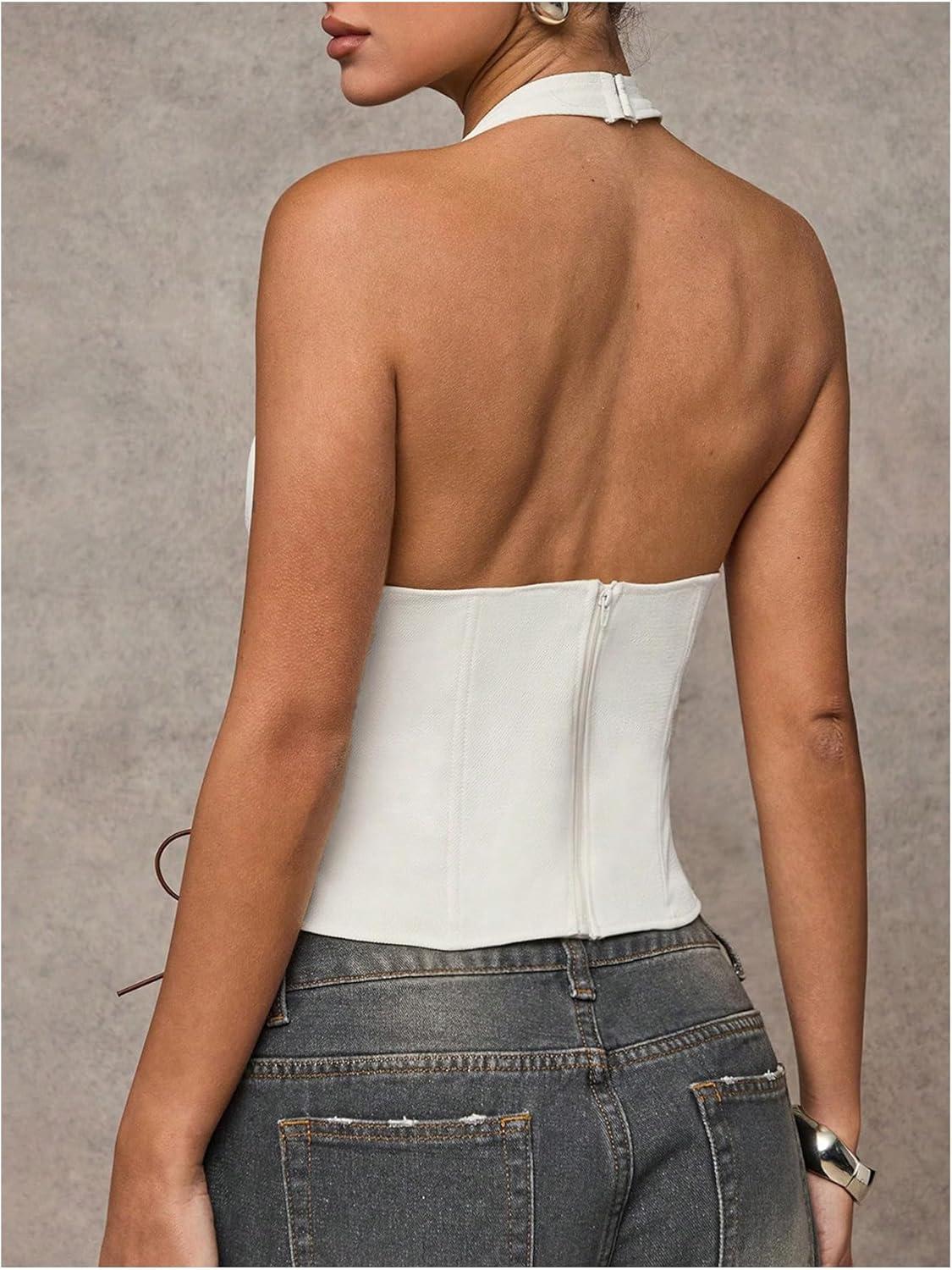 MakeMeChic Women’s Corset Halter Tops Halloween Lace Up Corset Tops Y2K Cowgirl Crop Top(White)