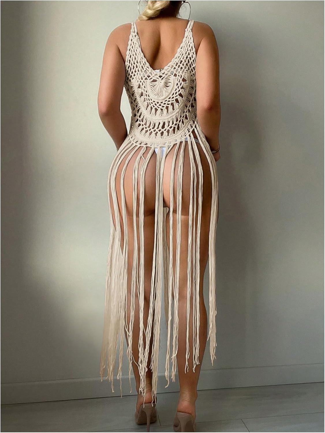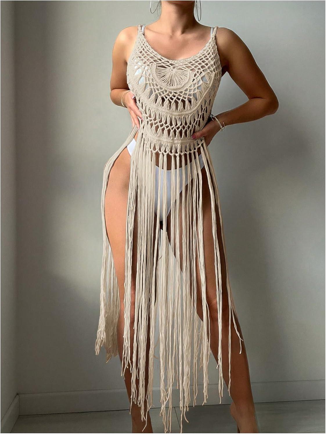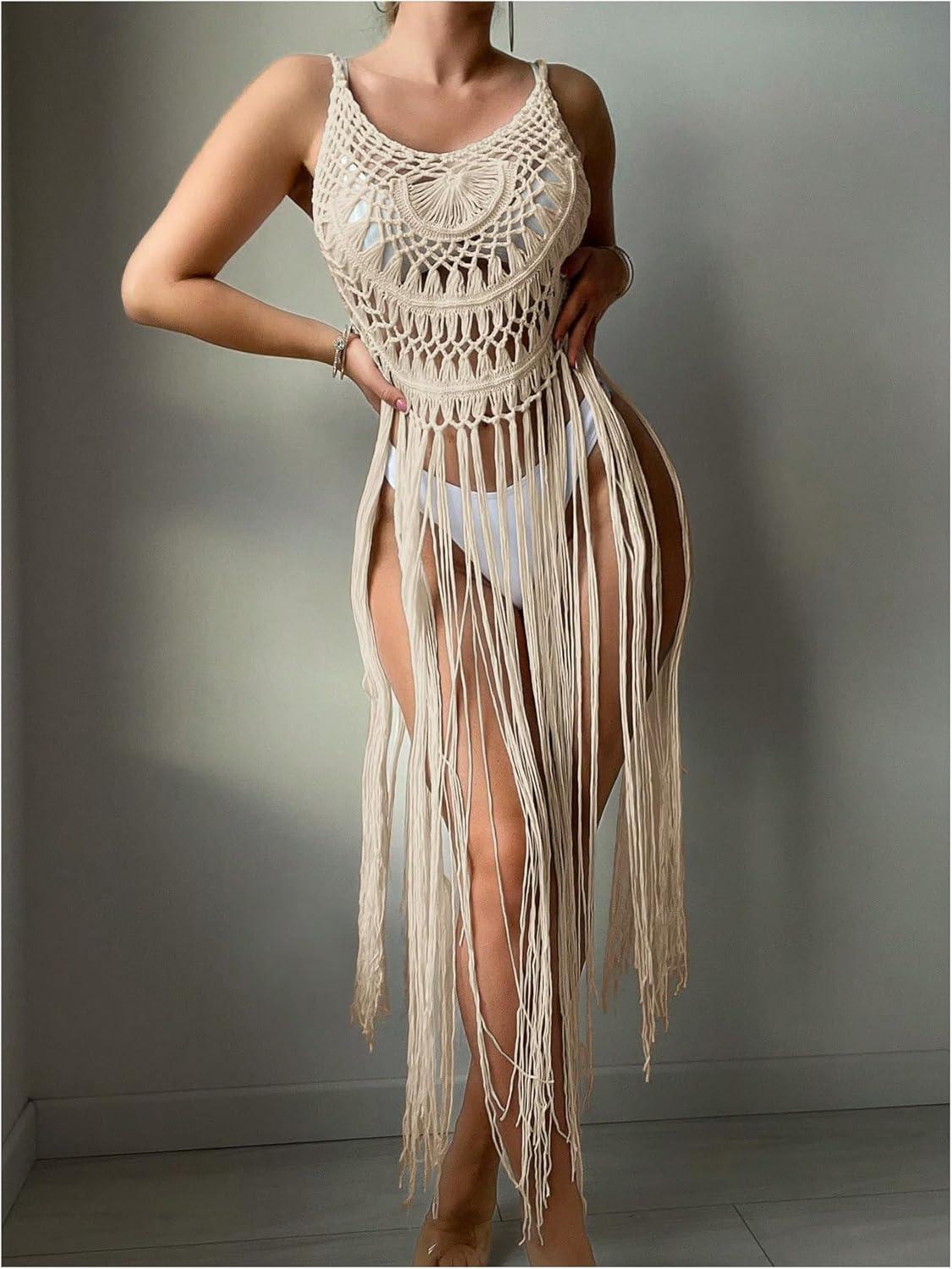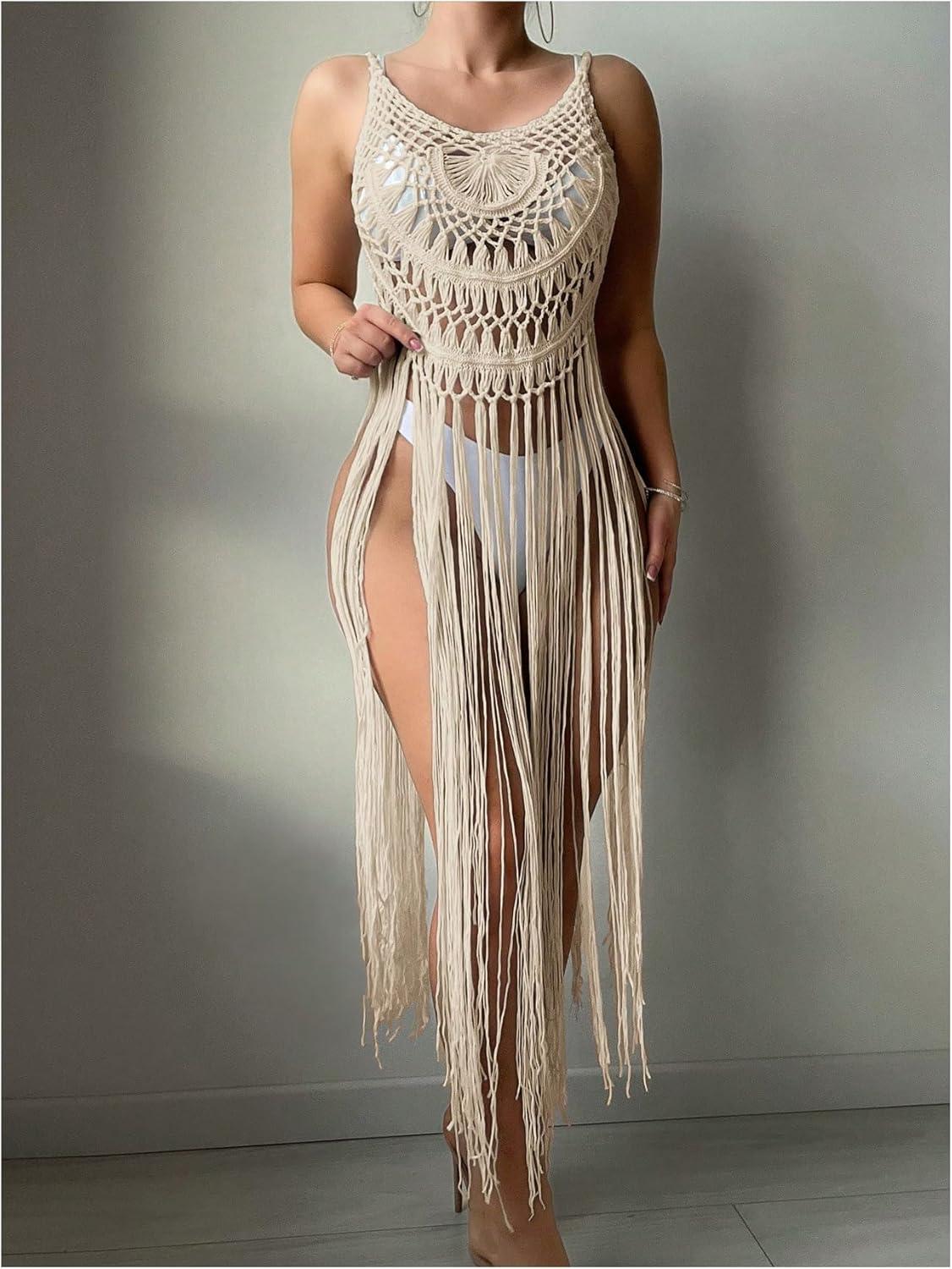MakeMeChic Women’s Crochet Fringe Cover Up Top Sleeveless Hollow Out Summer Beach Coverup(Apricot)