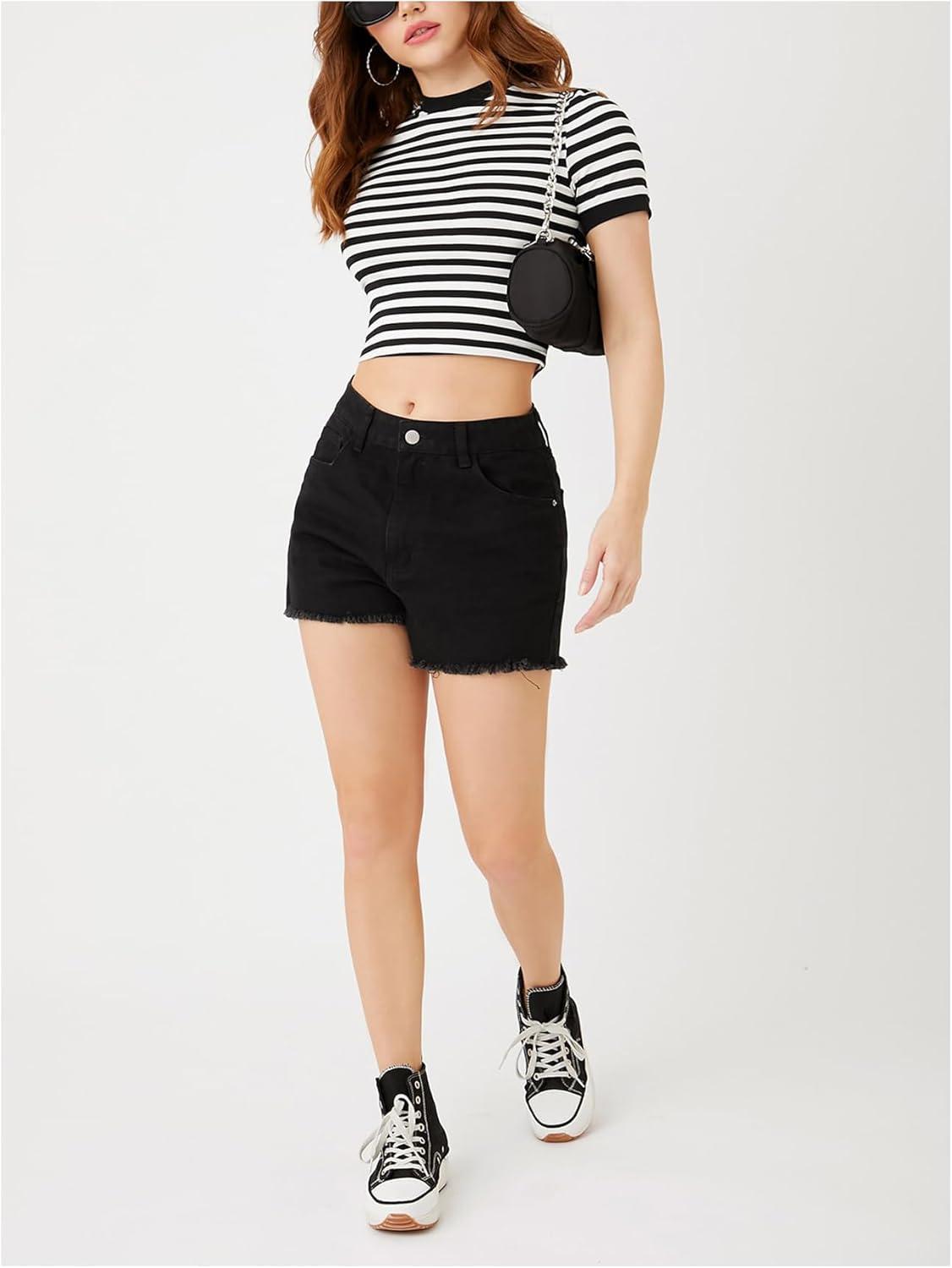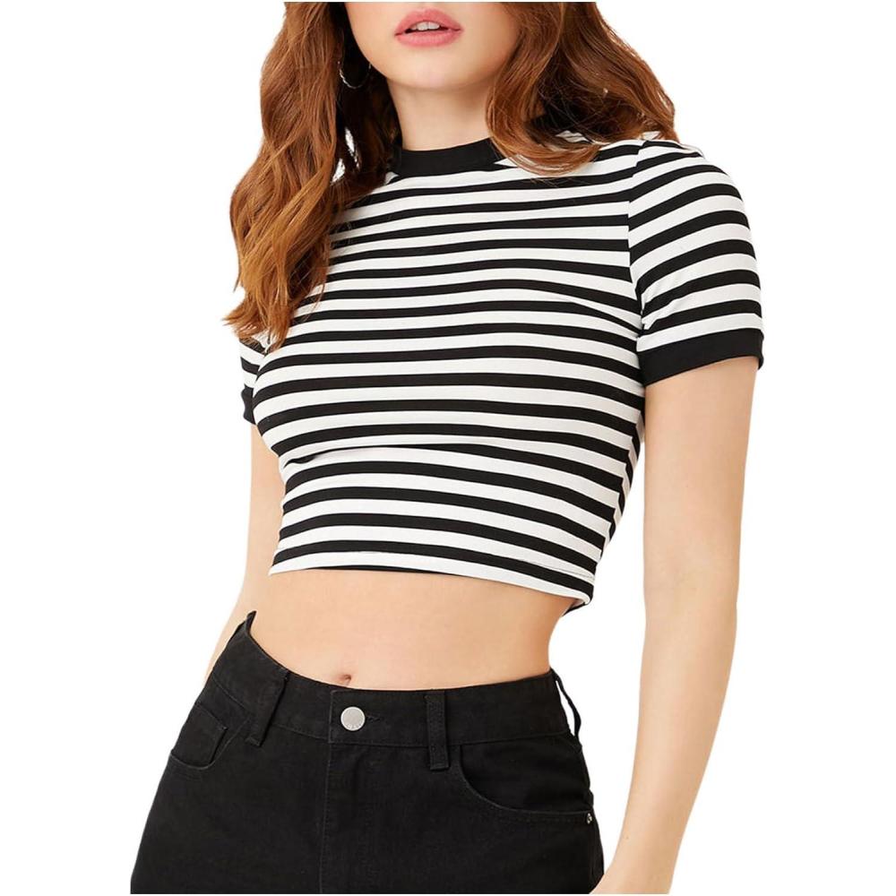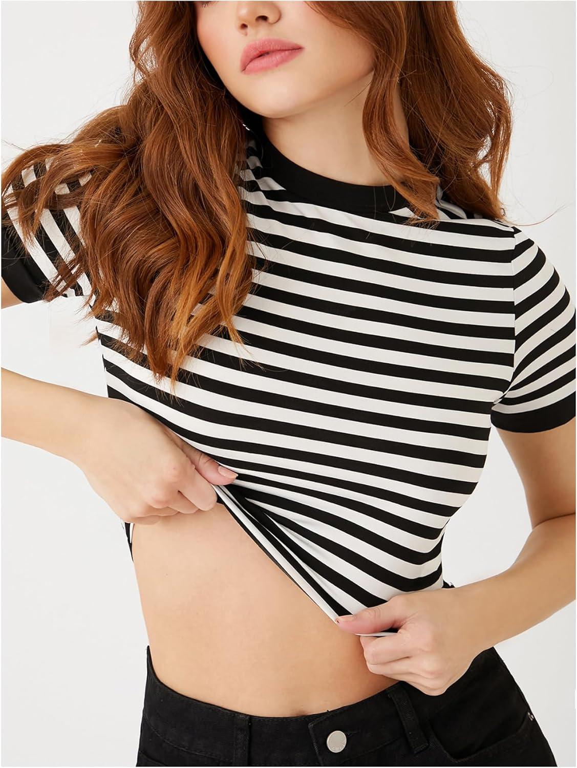 MakeMeChic Women’s Crop Tops Striped Short Sleeve Fitted Crew Neck Summer Tee Shirt(Black and White)