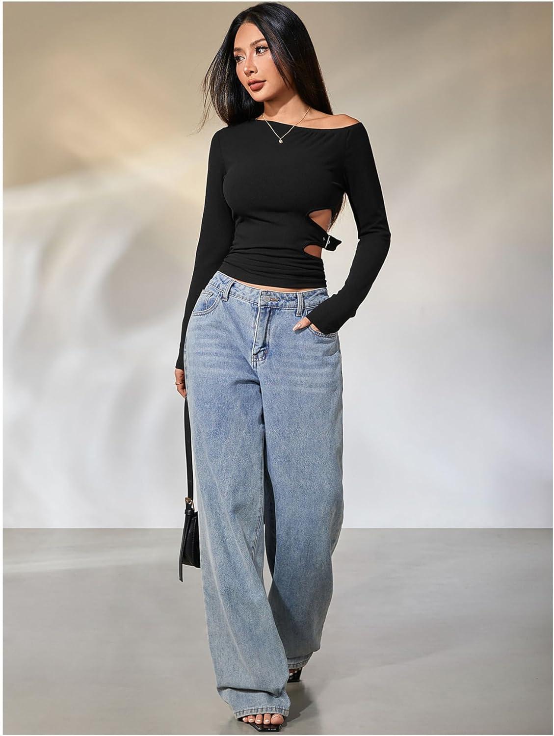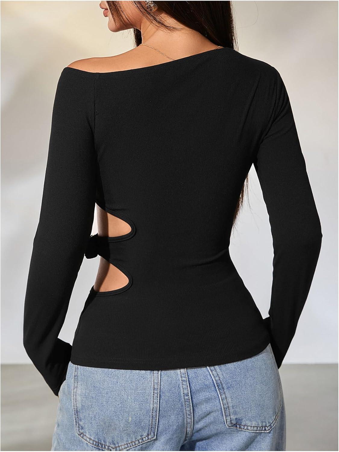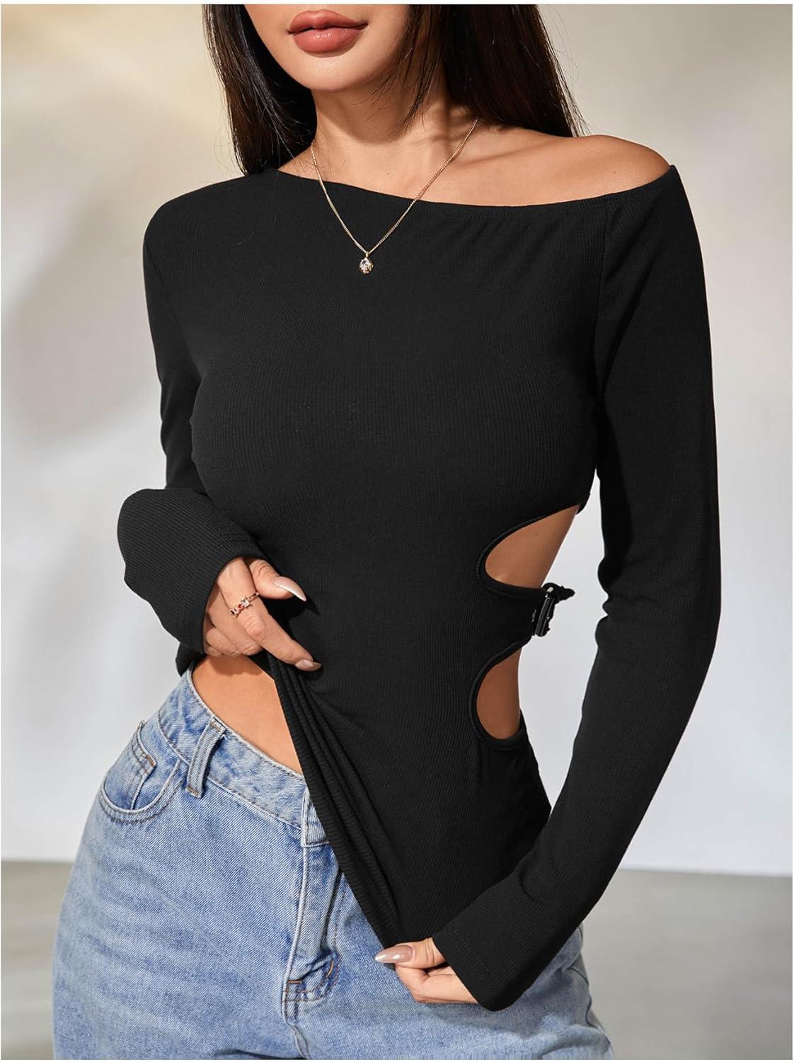 MakeMeChic Women's Cut Out Asymmetrical Long Sleeve Tops Fall One Shoulder Hollow Out Slim Fit Top(Black)