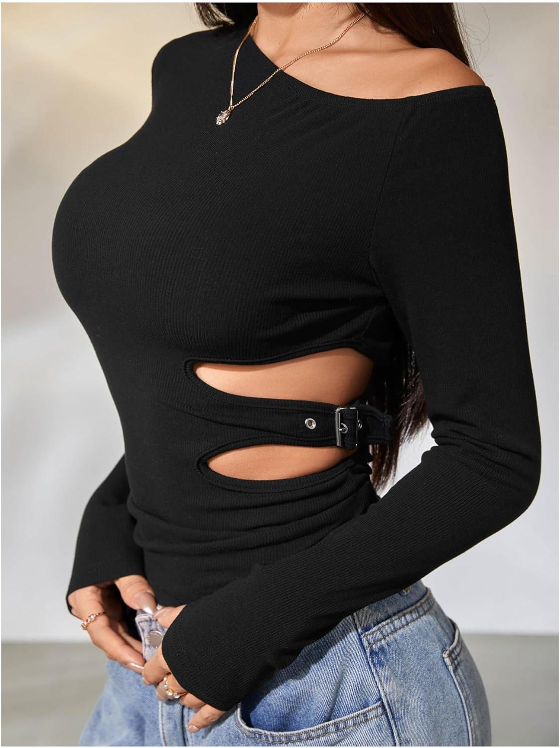 MakeMeChic Women’s Cut Out Asymmetrical Long Sleeve Tops Fall One Shoulder Hollow Out Slim Fit Top(Black)