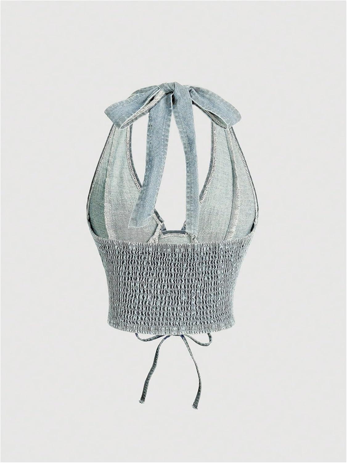 MakeMeChic Women's Denim Corset Top Halter Backless Shirred Y2K Crop Tops(Medium Wash)