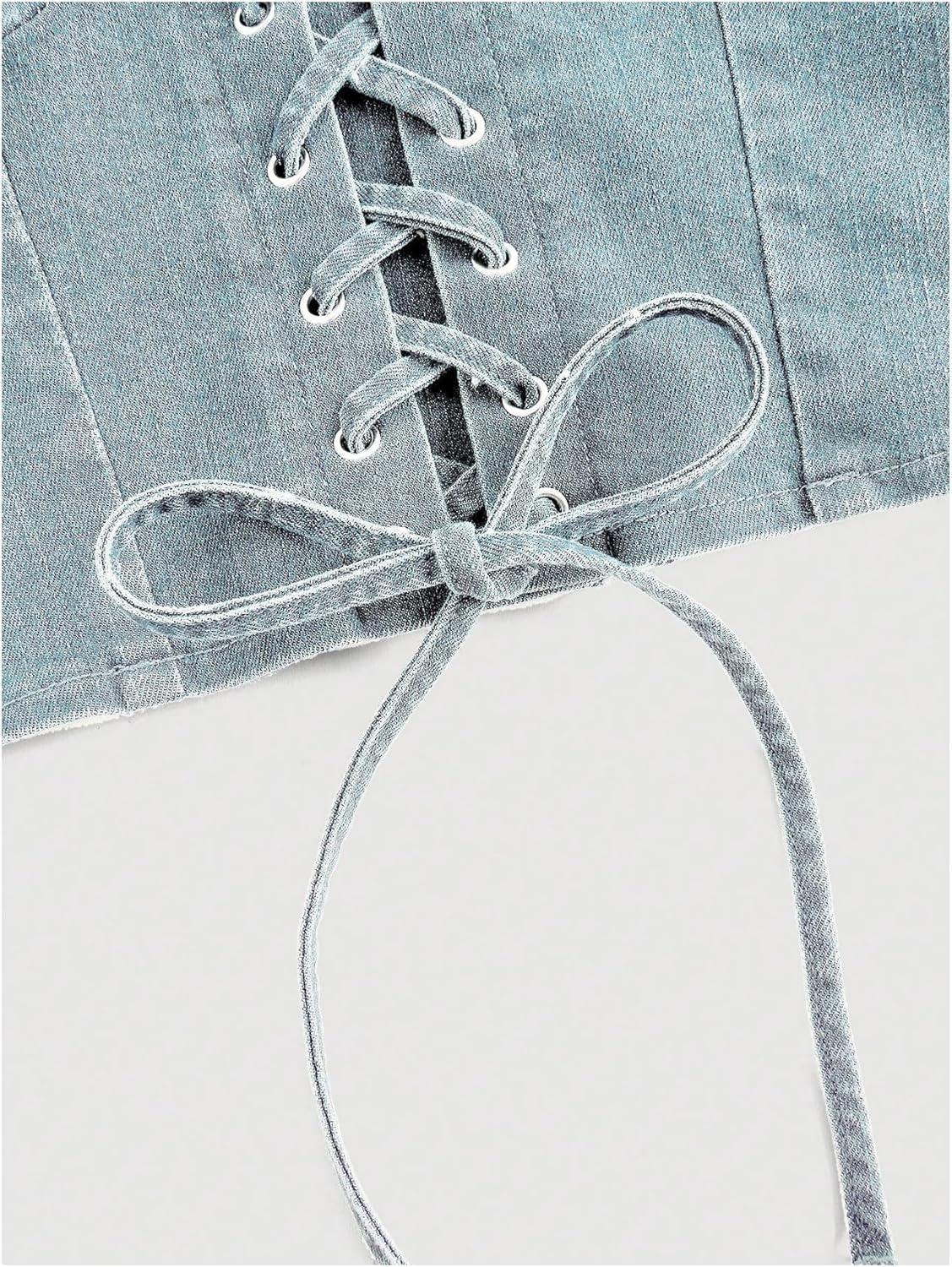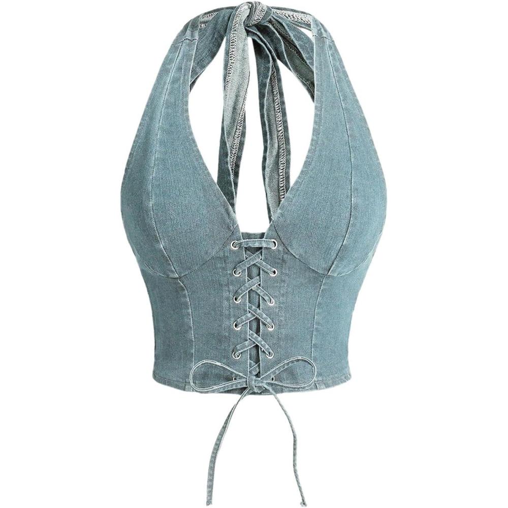 MakeMeChic Women’s Denim Corset Top Halter Backless Shirred Y2K Crop Tops(Medium Wash)