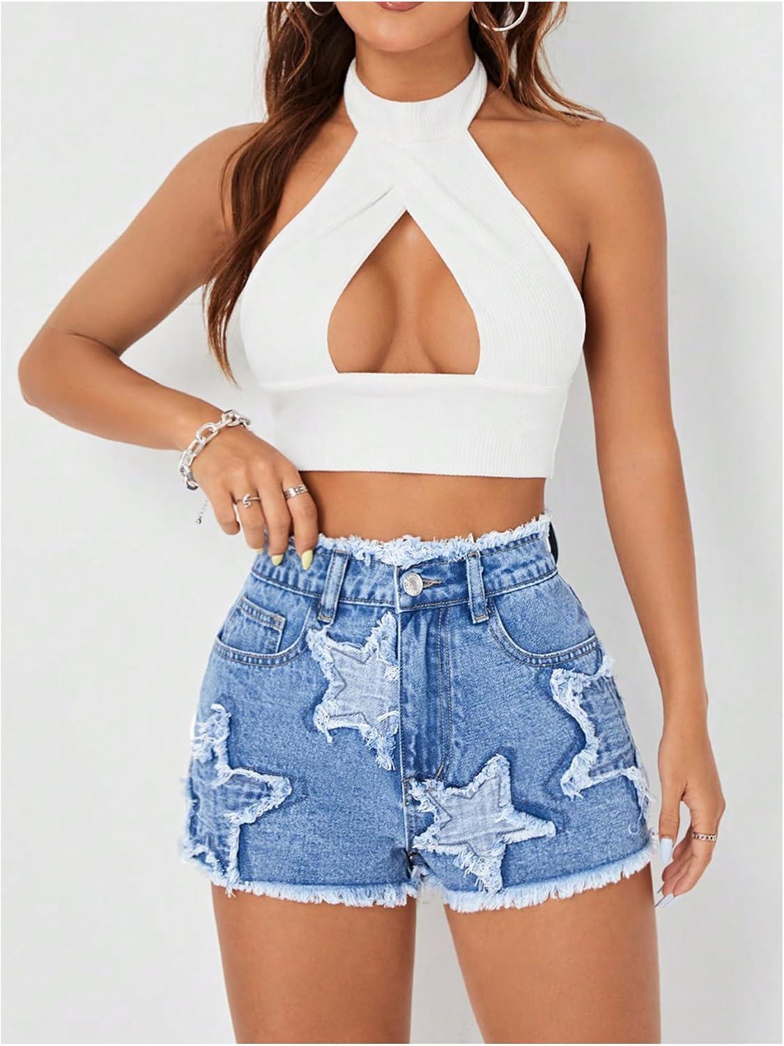 imageMakeMeChic Womens Denim Shorts Star Distressed Trim Straight Leg High Waist Jean ShortsMedium Wash