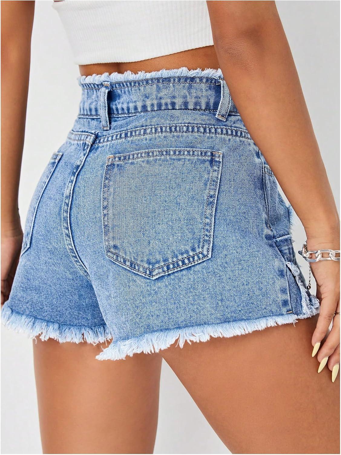 MakeMeChic Women’s Denim Shorts Star Distressed Trim Straight Leg High Waist Jean Shorts(Medium Wash)
