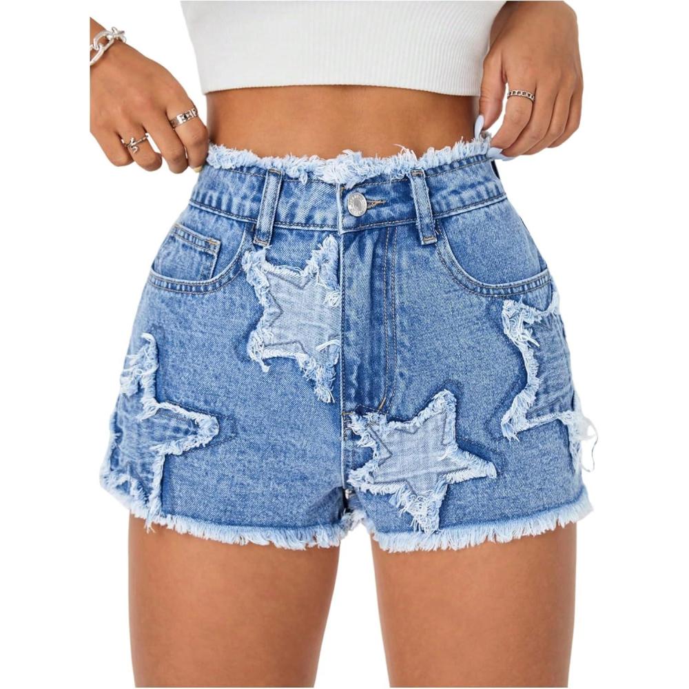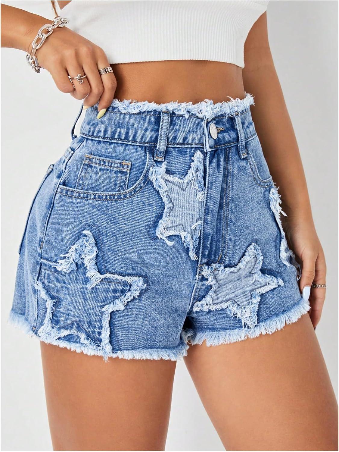 MakeMeChic Women's Denim Shorts Star Distressed Trim Straight Leg High Waist Jean Shorts(Medium Wash)