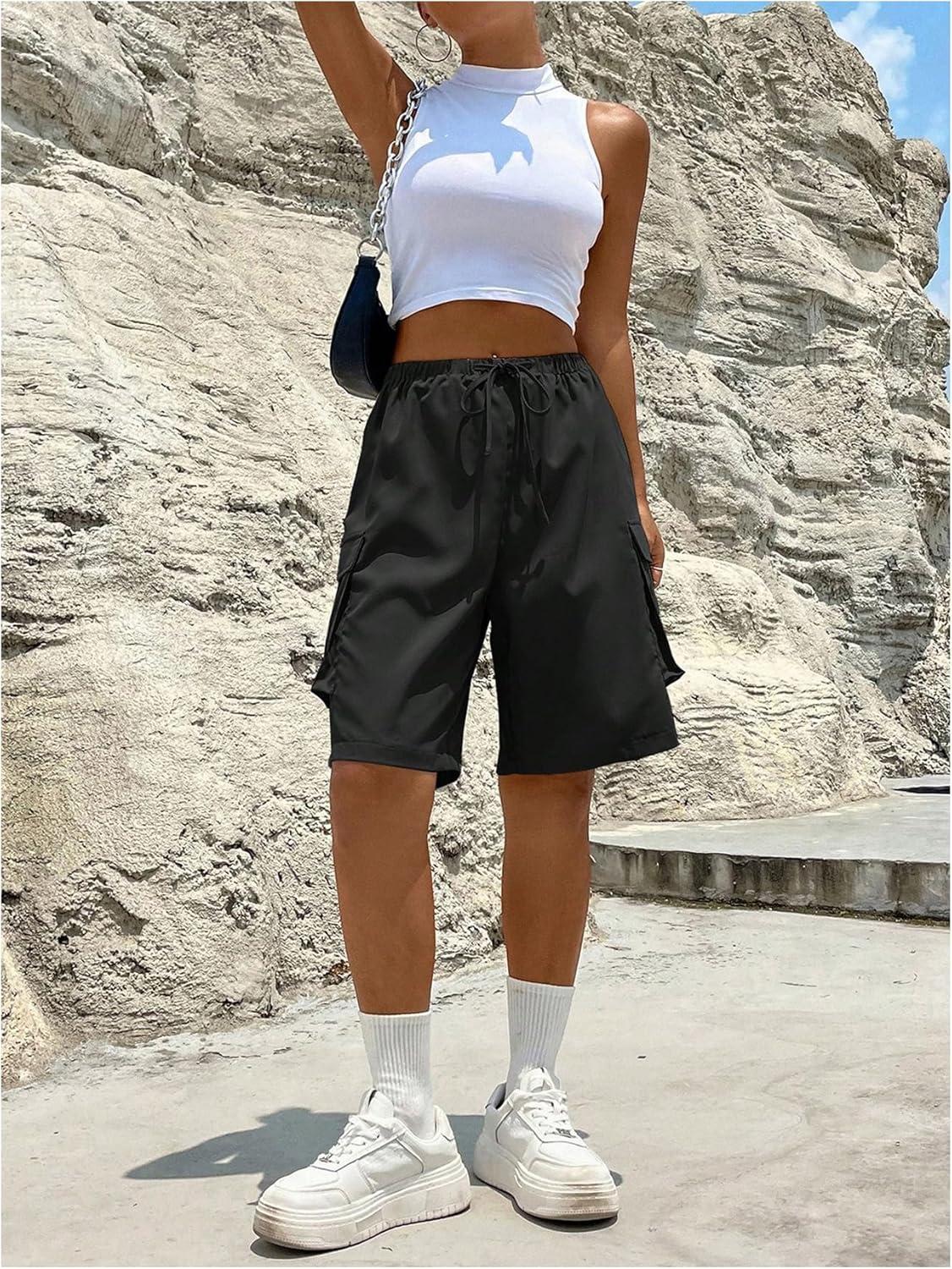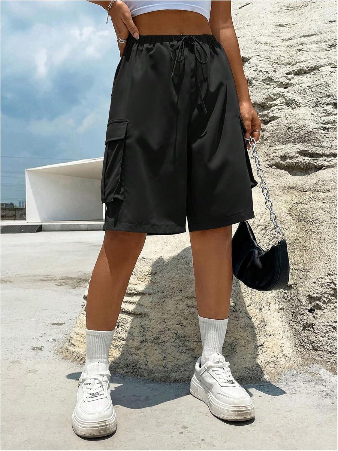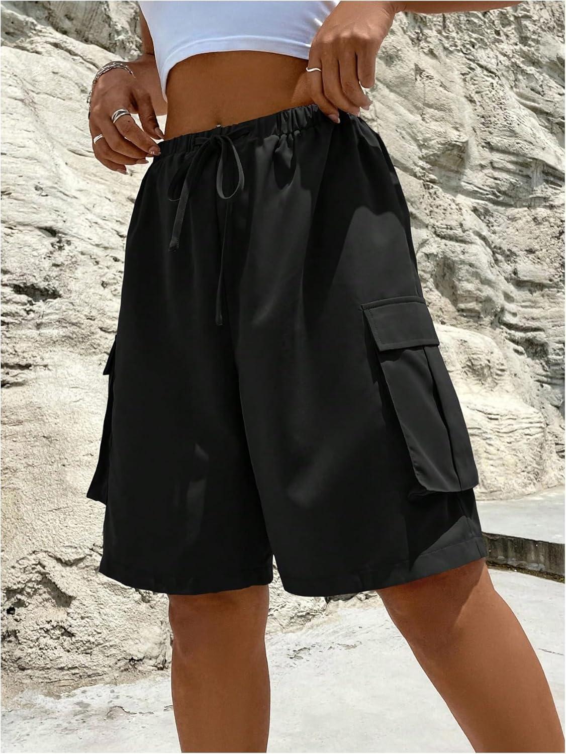 MakeMeChic Women’s Drawstring Elastic Waist Loose Wide Leg Cargo Bermuda Shorts with Pocket(Black)