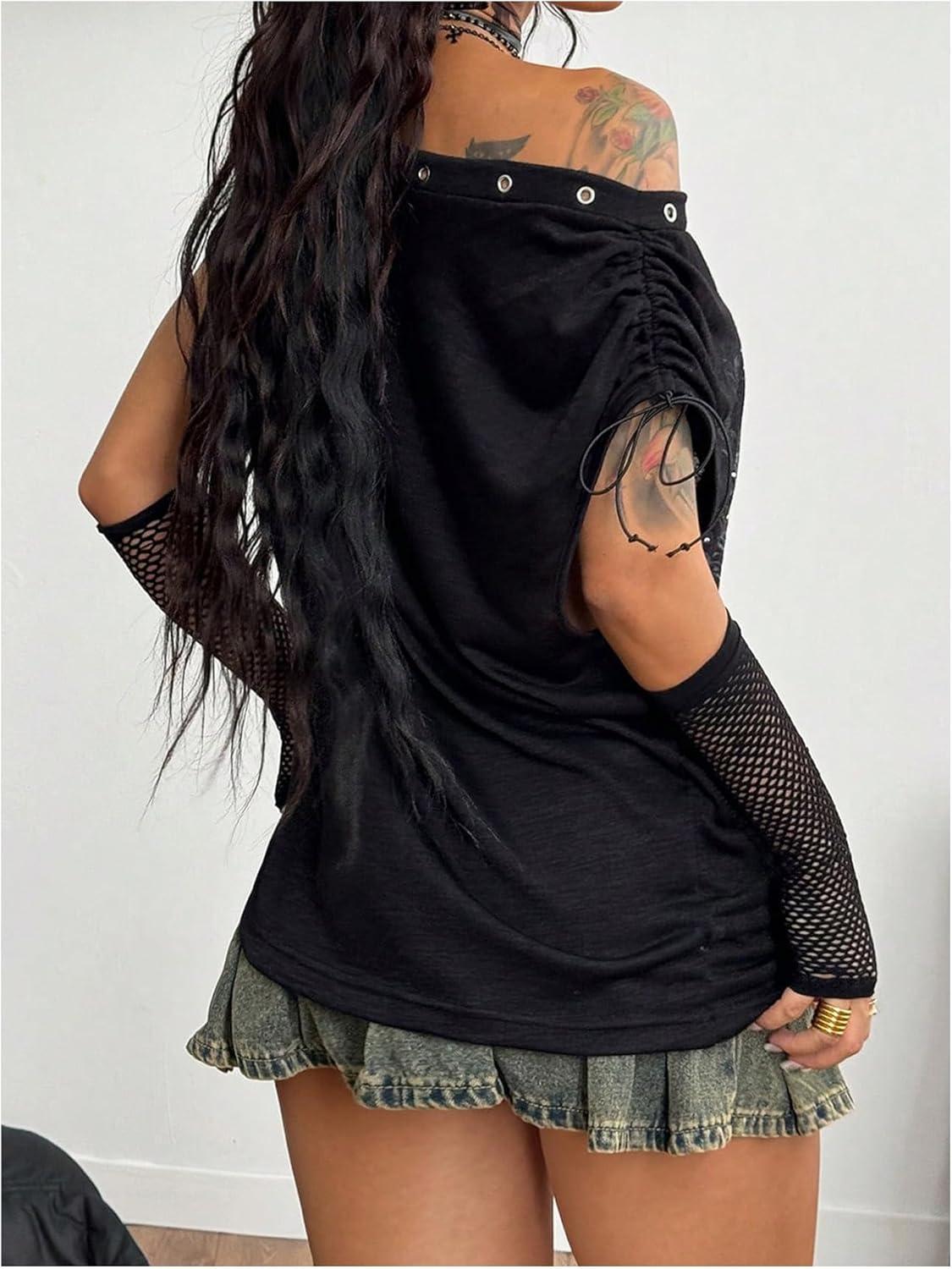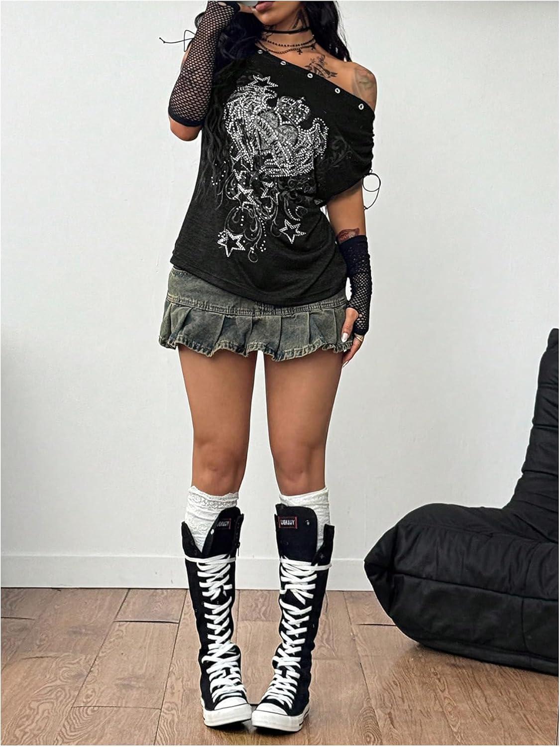 MakeMeChic Women’s Emo Grunge Shirts Gothic Alt Clothes Graphic Tee Y2k Off The Shoulder Tops(Black Rhinestone)