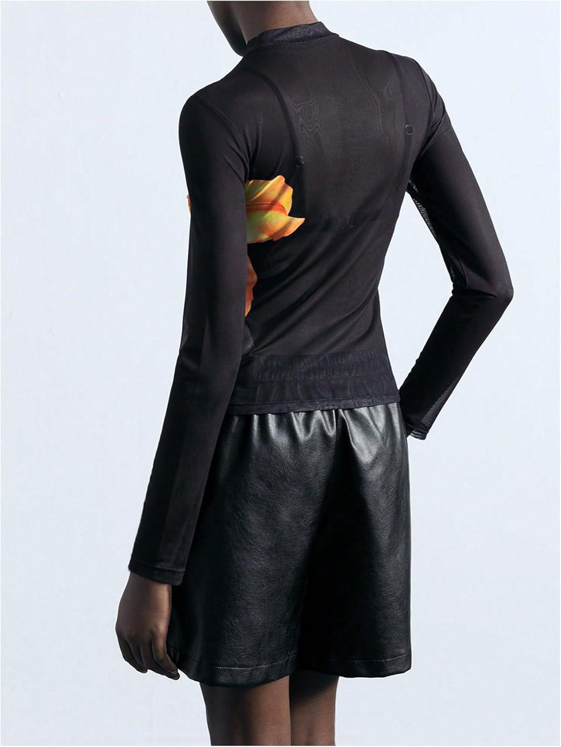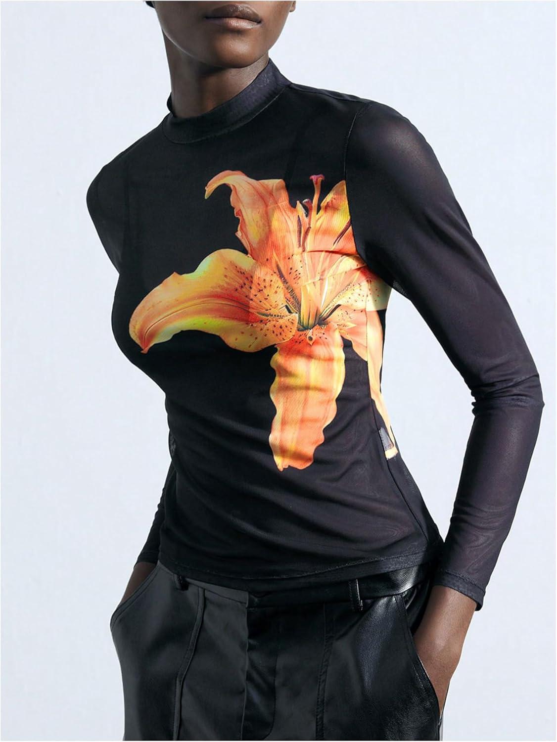 MakeMeChic Women's Floral Print Mesh Sheer Mock Neck Long Sleeve Slim Fit Tee Shirt Tops(Black)