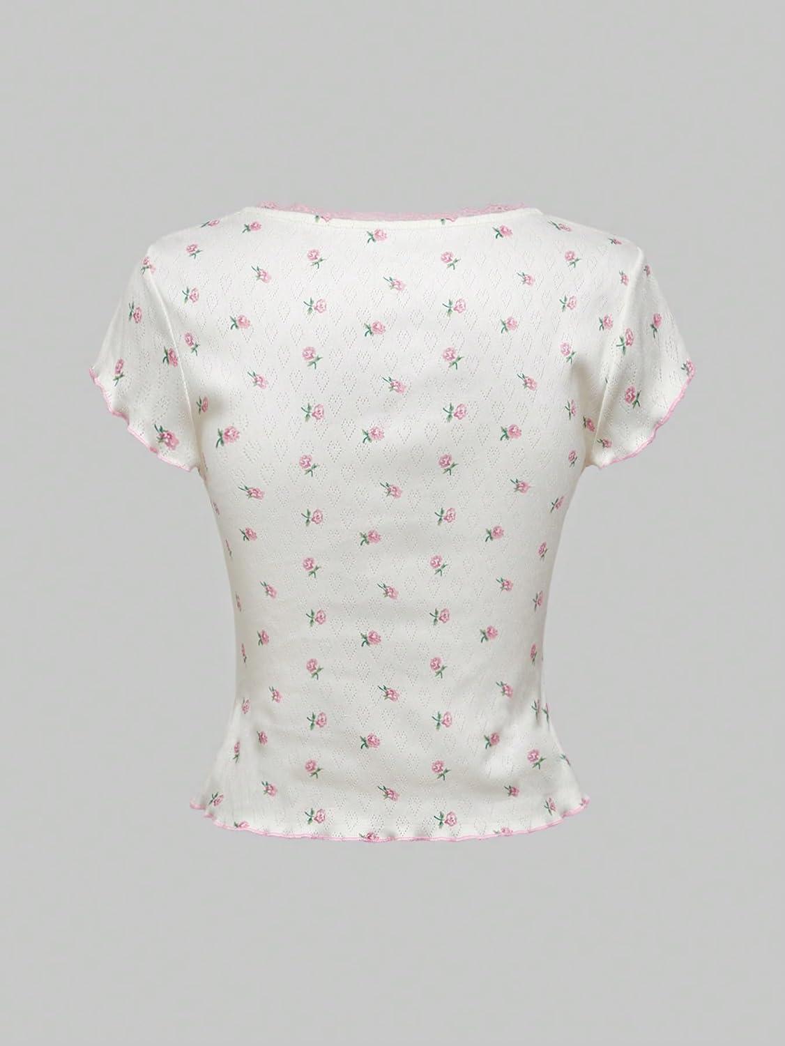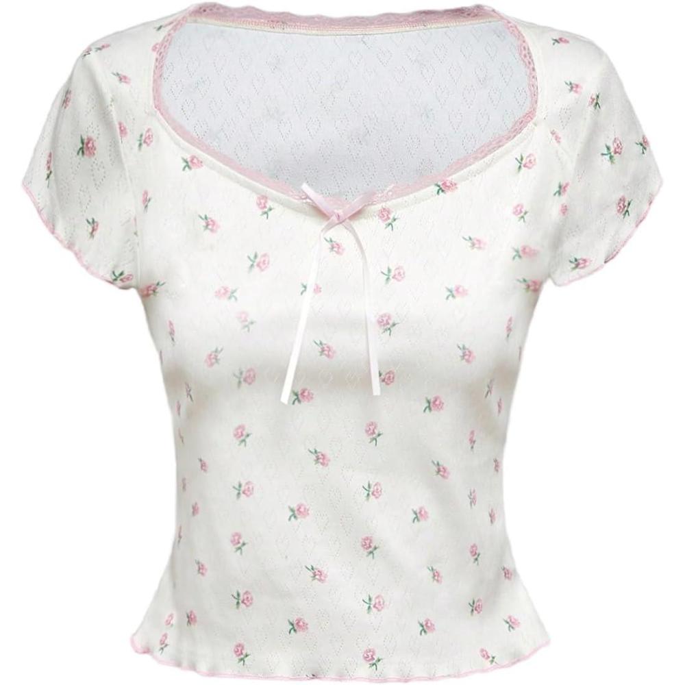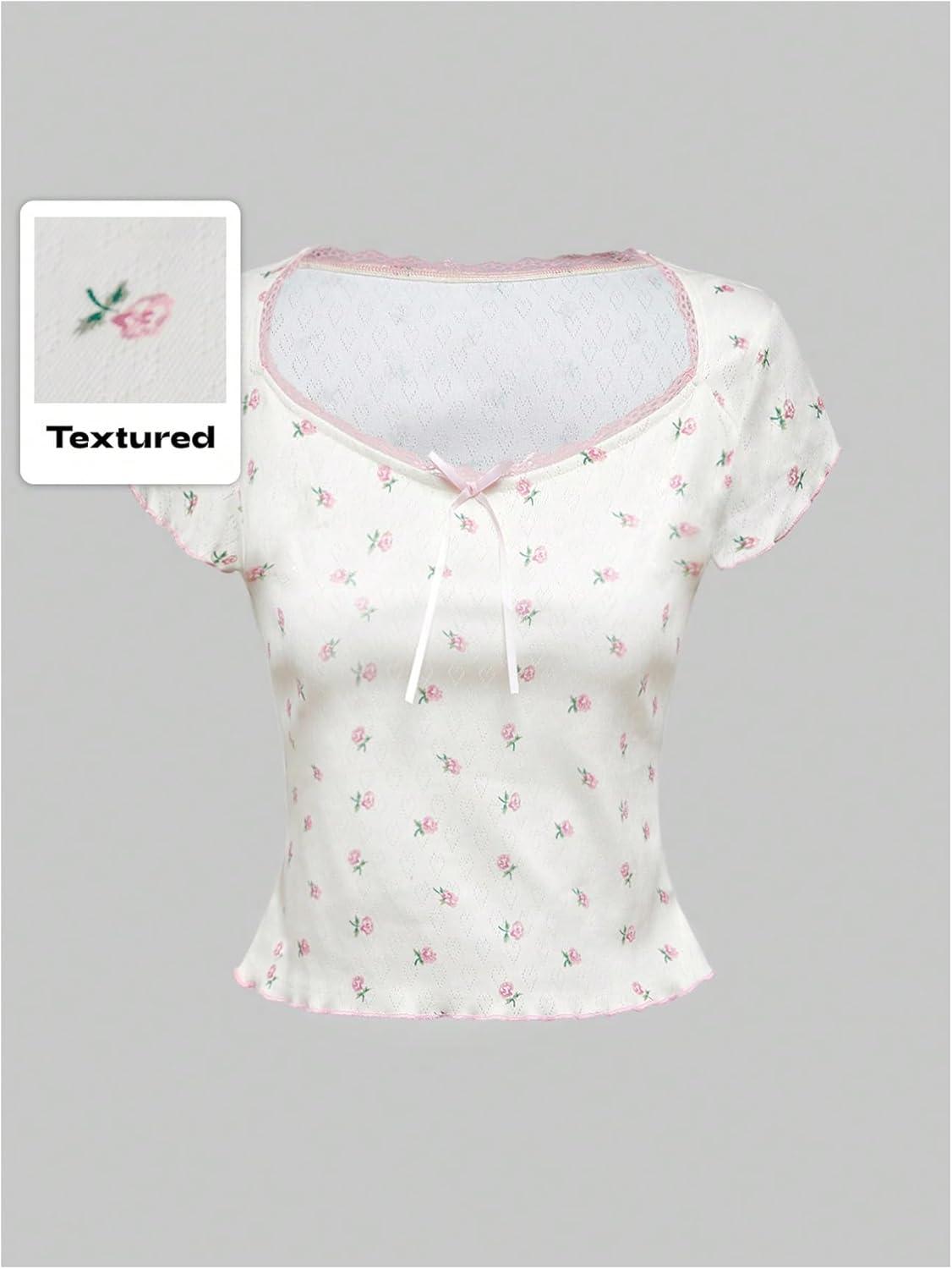 MakeMeChic Women’s Floral Textured Scoop Neck Short Sleeve Tee Shirt Summer Y2K Crop Tops(White)