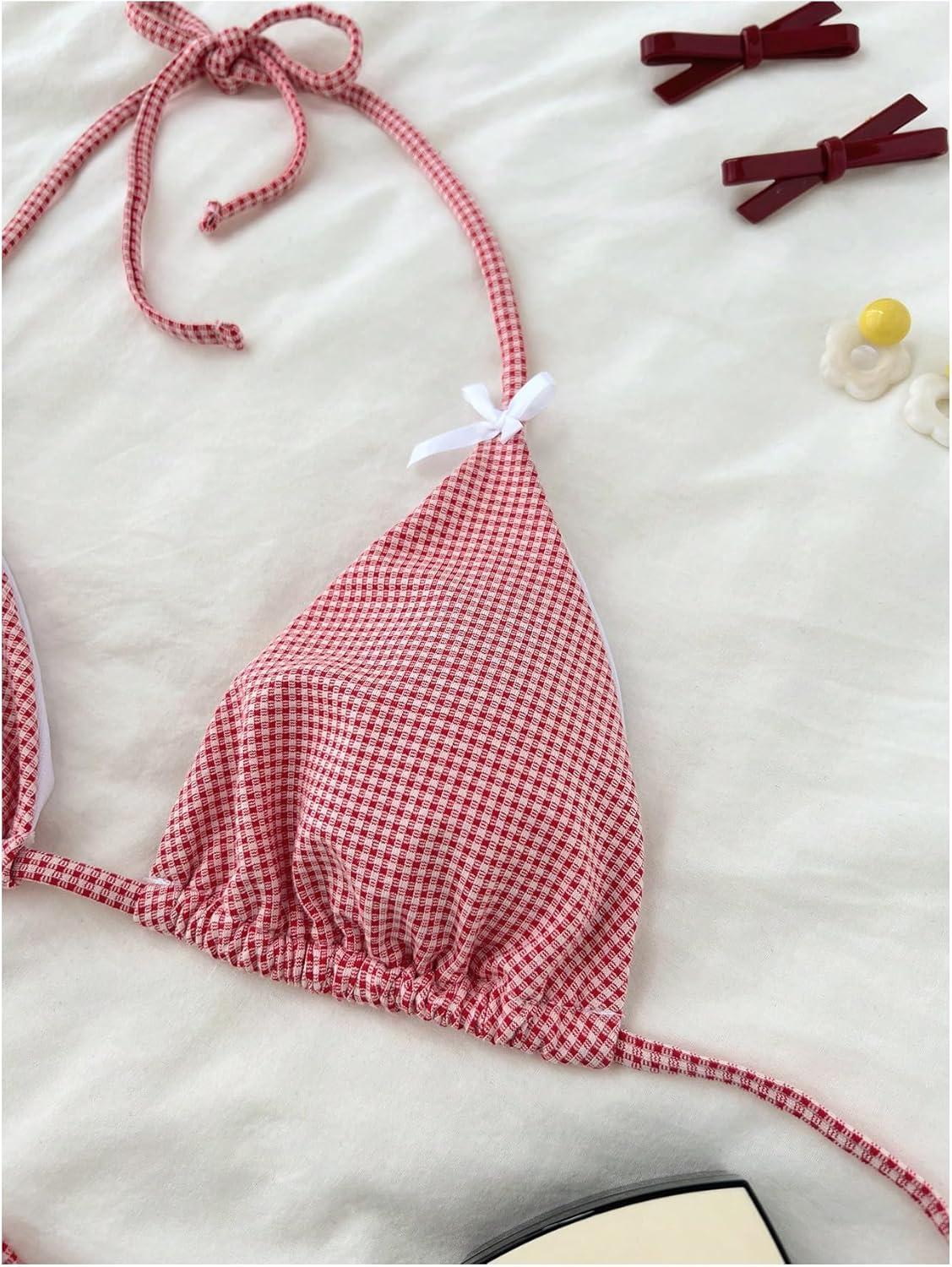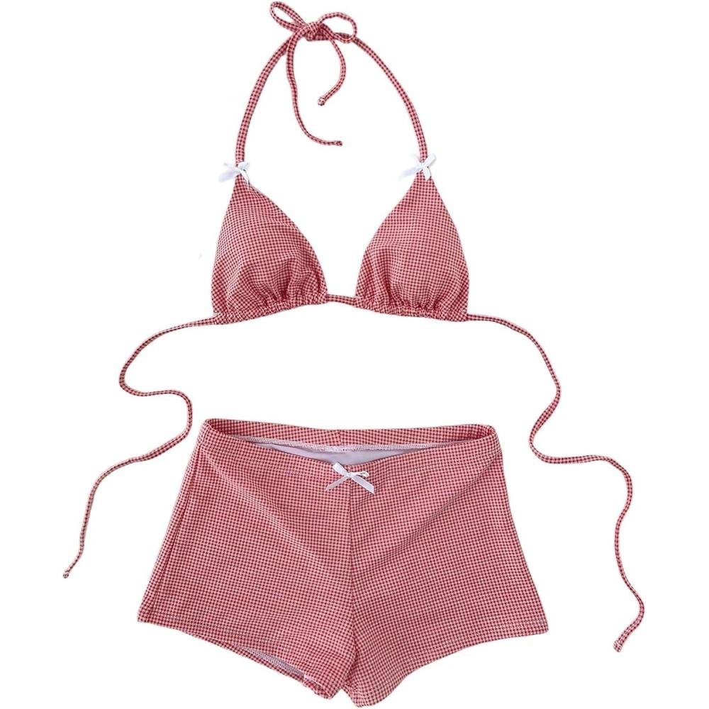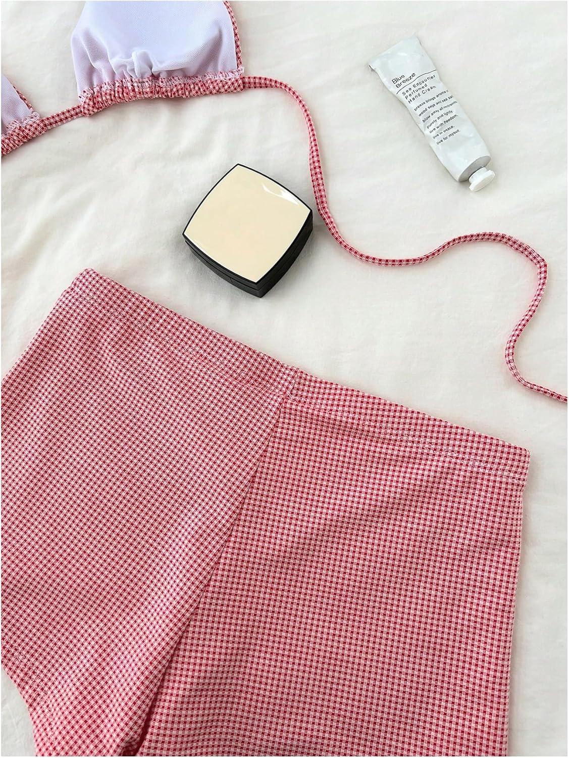 MakeMeChic Women’s Gingham High Waisted Bikini Set Halter Triangle Tie Back Bathing Suit with Boyshorts(Red and White)