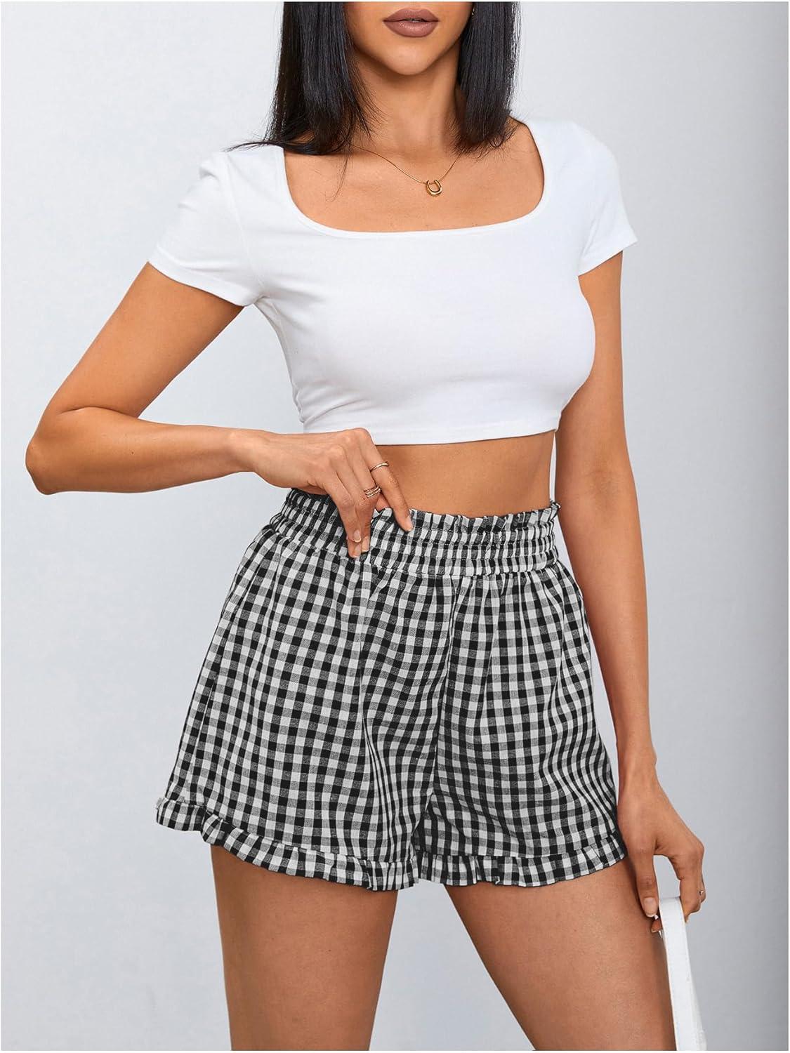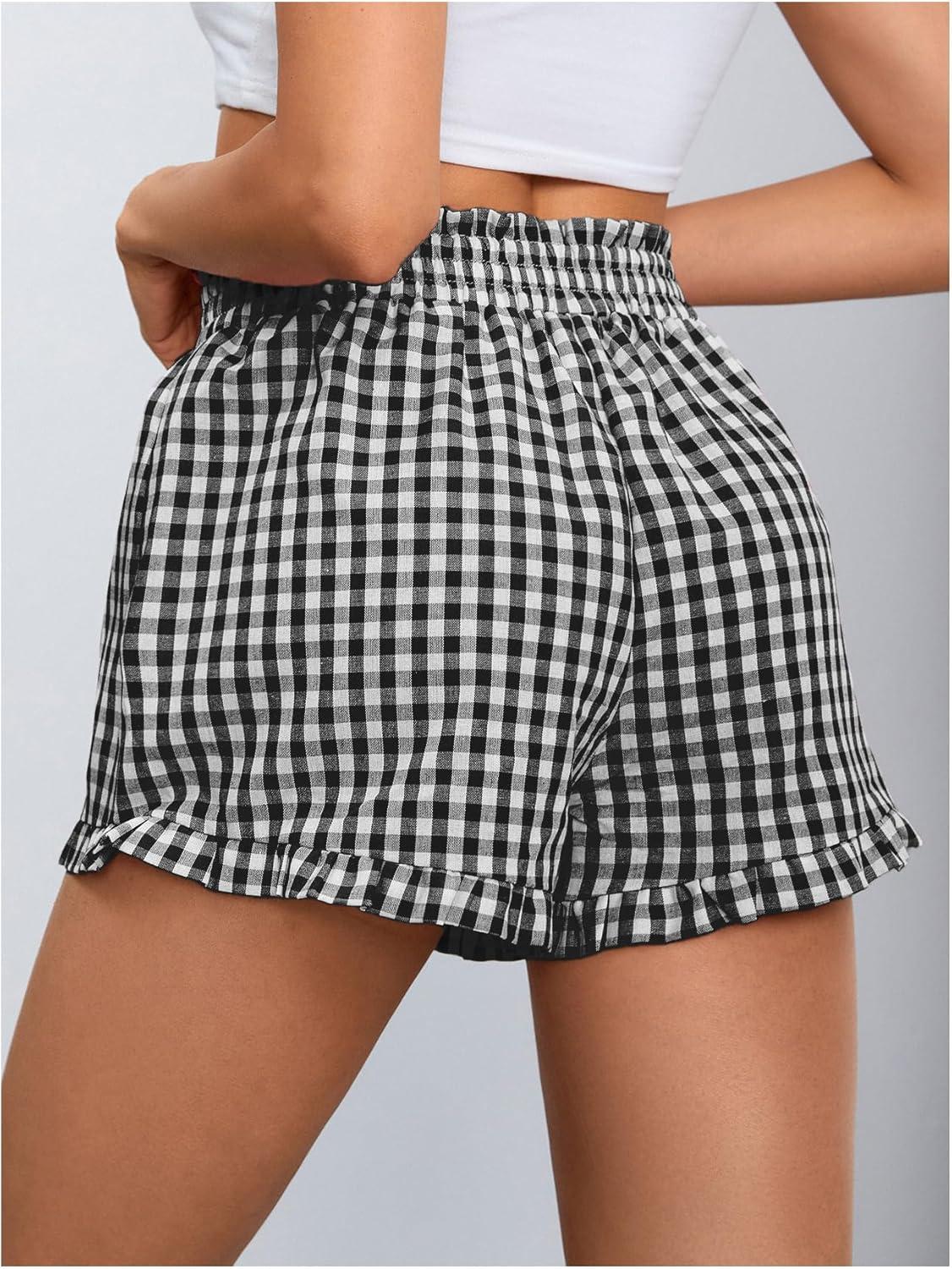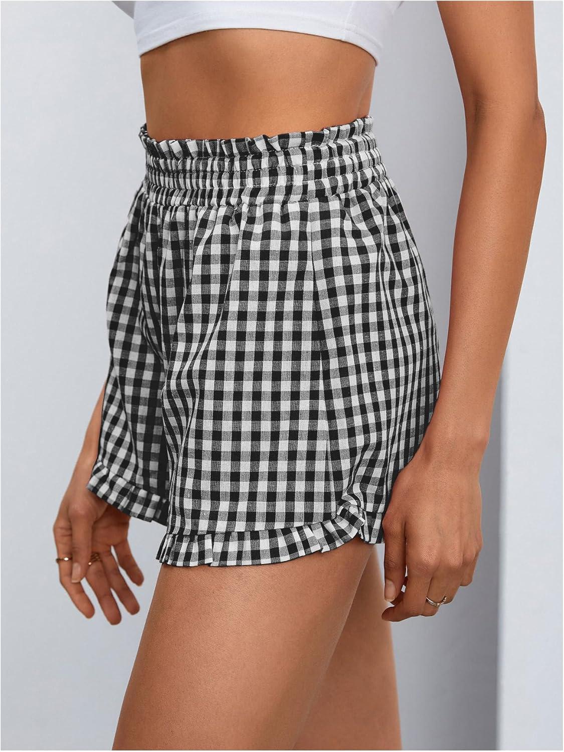 MakeMeChic Women’s Gingham Ruffle Boxer Shorts Elastic High Waist Pajamas Lounge Shorts(Black and White)