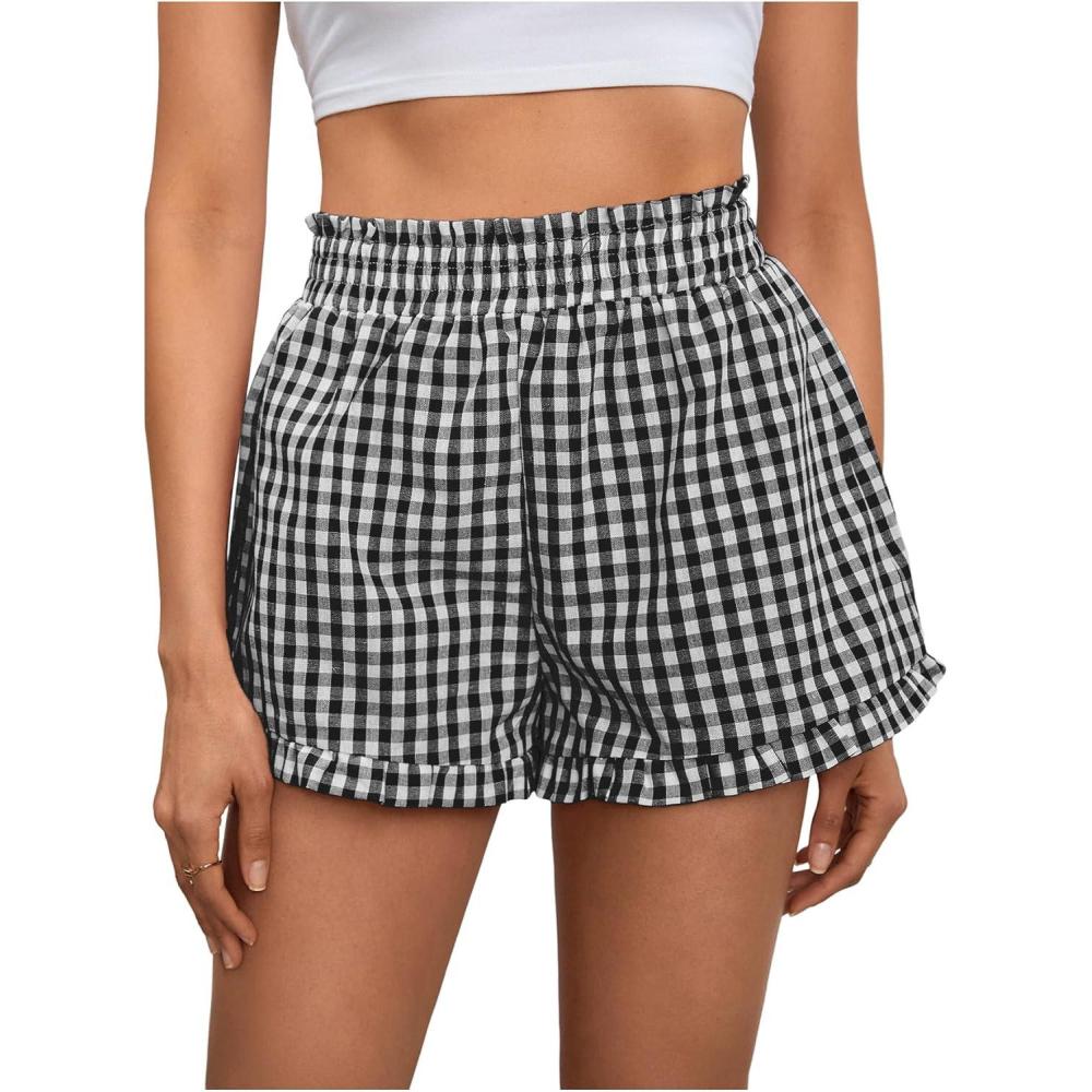 MakeMeChic Women's Gingham Ruffle Boxer Shorts Elastic High Waist Pajamas Lounge Shorts(Black and White)