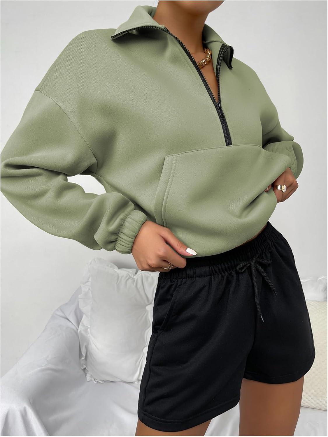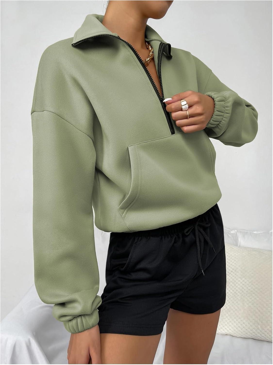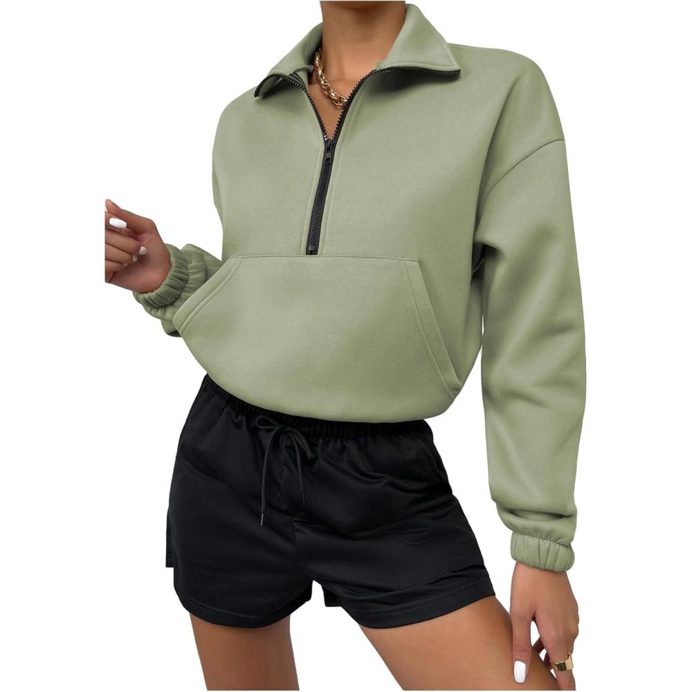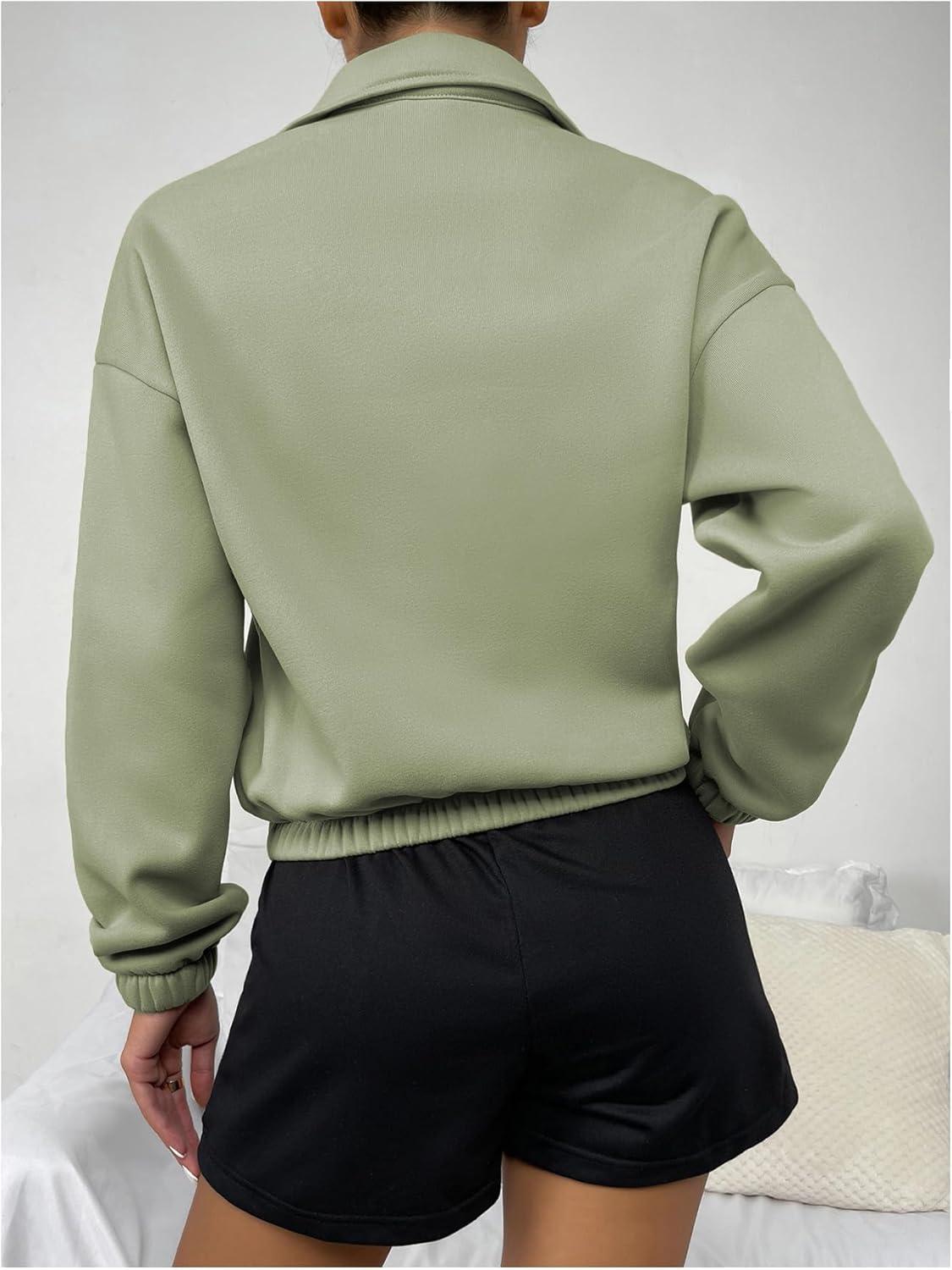 imageMakeMeChic Womens Half Zip Collared Sweatshirts Long Sleeve Drop Shoulder Crop Pullover Top Lime Green Large