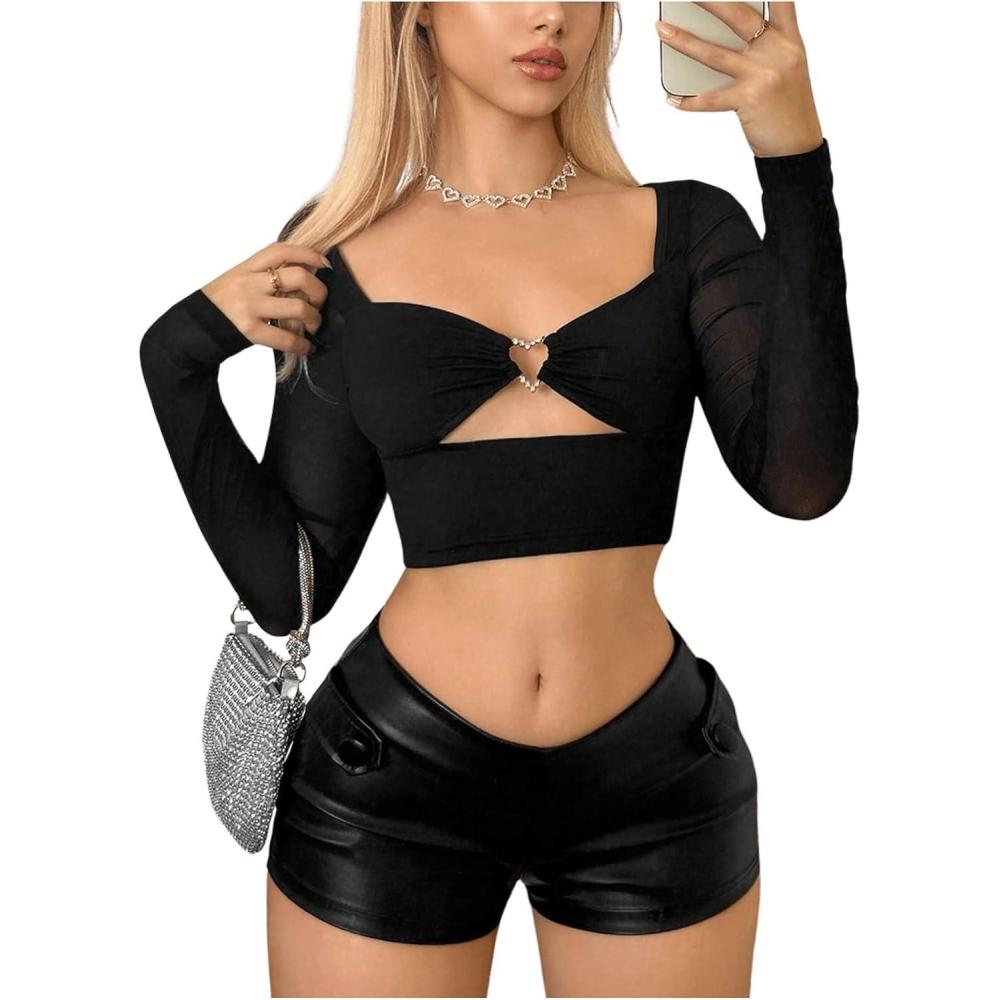 MakeMeChic Women’s Heart Cut Out Tops Mesh Sheer Sweetheart Neck Long Sleeve Crop Tee Shirts(Black)