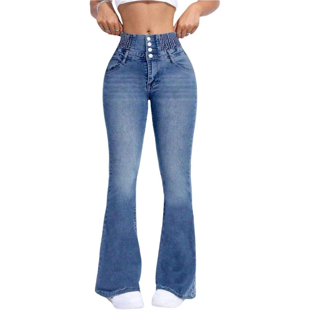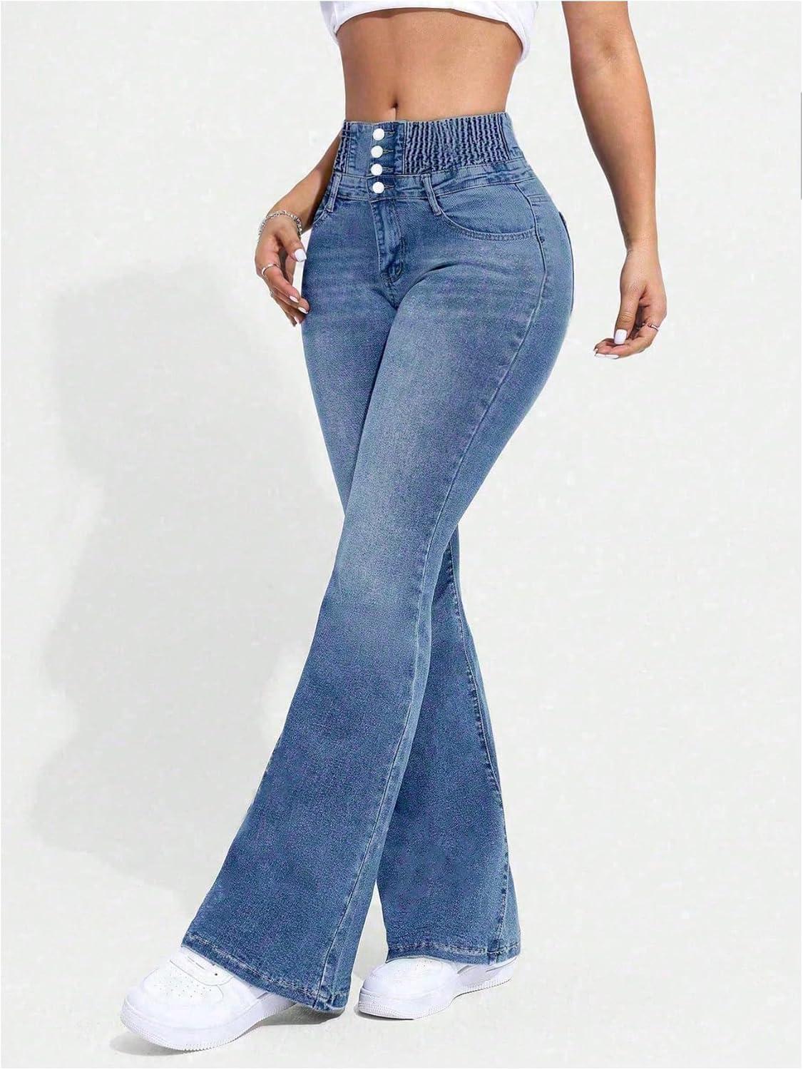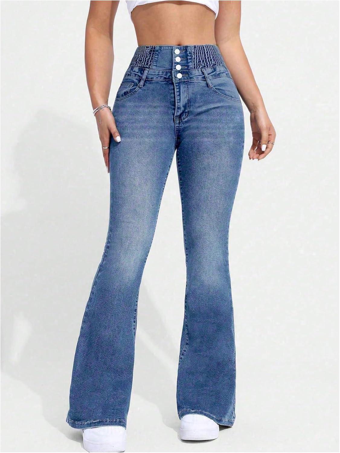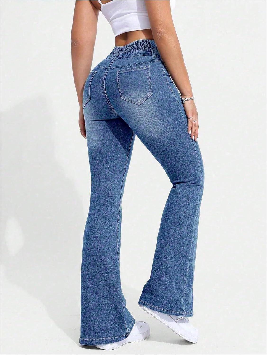 MakeMeChic Women’s High Waisted Skinny Jeans Y2K Denim Flare Pants Bell Bottom Shirred Trousers with Pocket(Medium Wash)