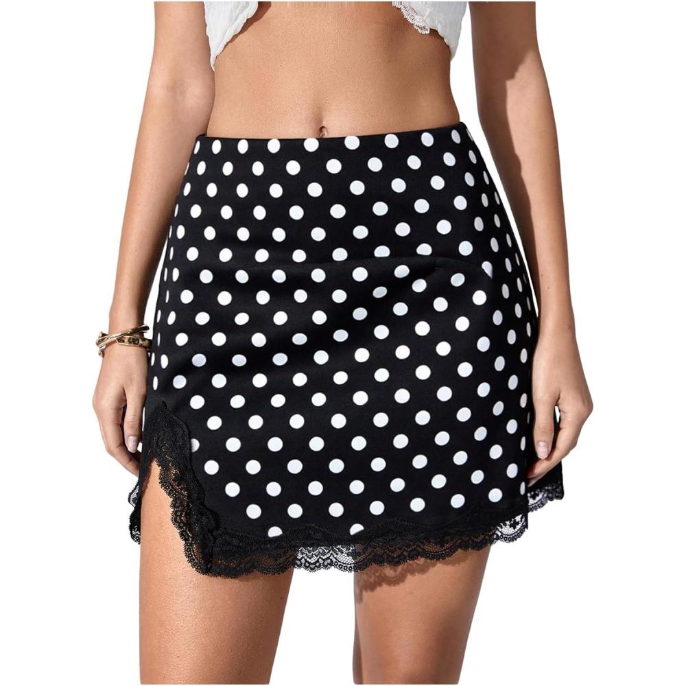 imageMakeMeChic Womens Lace Trim Mini Skirt Split Hem Bodycon Short Party Club SkirtsBlack and White